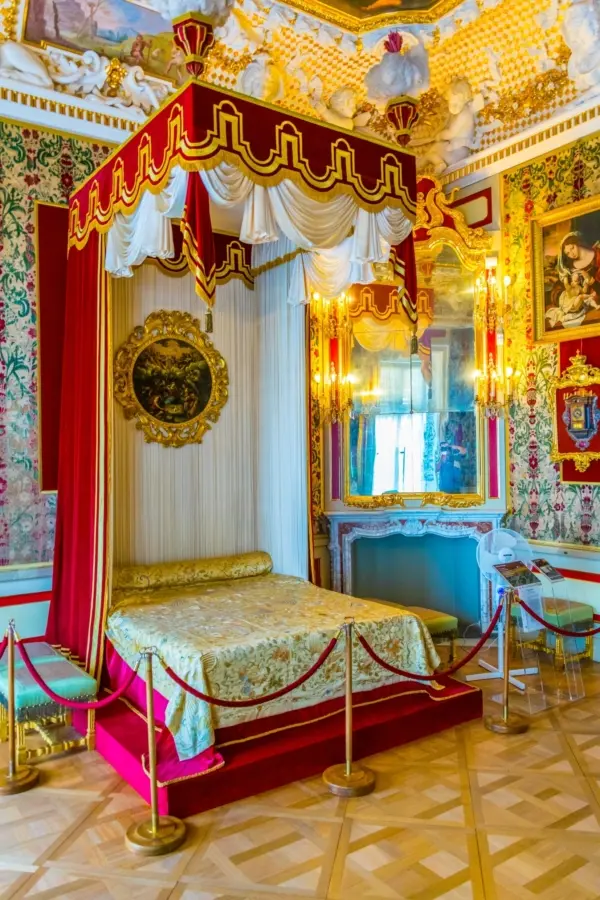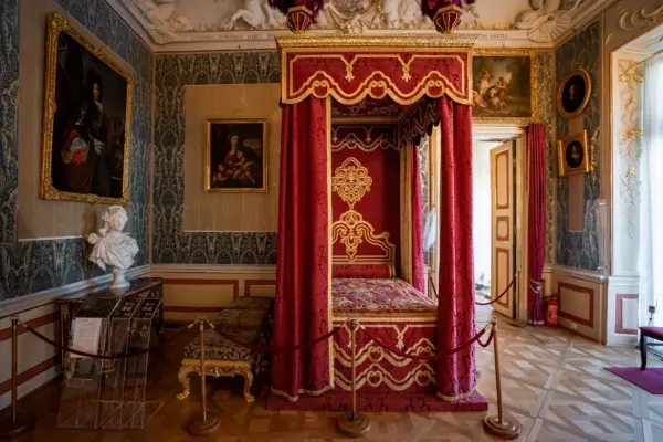 國王臥房的牆上貼著意大利熱那亞風格(Genoa-style)的天鵝絨(velvet)壁紙。整間房的藝術和裝飾品呈現夏天的寓意,例如門框上方的繪畫(王后的睡房則呈現春天的景致)。房間裏也擺滿了十八世紀的法國傢俱,包括路易十四的凳子,以及法國知名櫥櫃製造商布爾(André-Charles Boulle)工作室為路易十四首席大臣紅衣主教馬薩林(Cardinal Mazarin)製作的衣櫃仿品。
