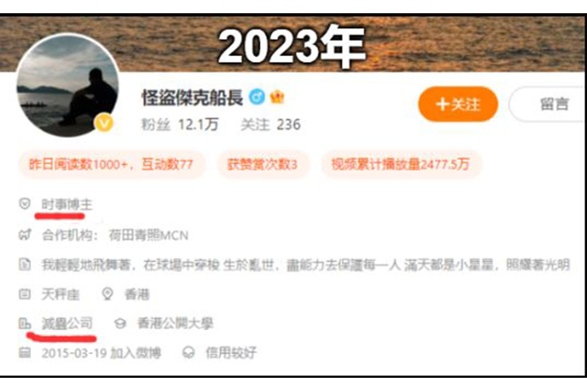 言歸正傳,我查看了十個八個大V港警微博,全都在頁頂標明是「香港警察」,但那個「怪盜傑克船長」沒有——他介紹自己為「时事博主」(但去年他是寫「香港警察」的),「合作机构」是「荷田青照MCN」,工作界別一欄居然填「滅蟲公司」!(注5)