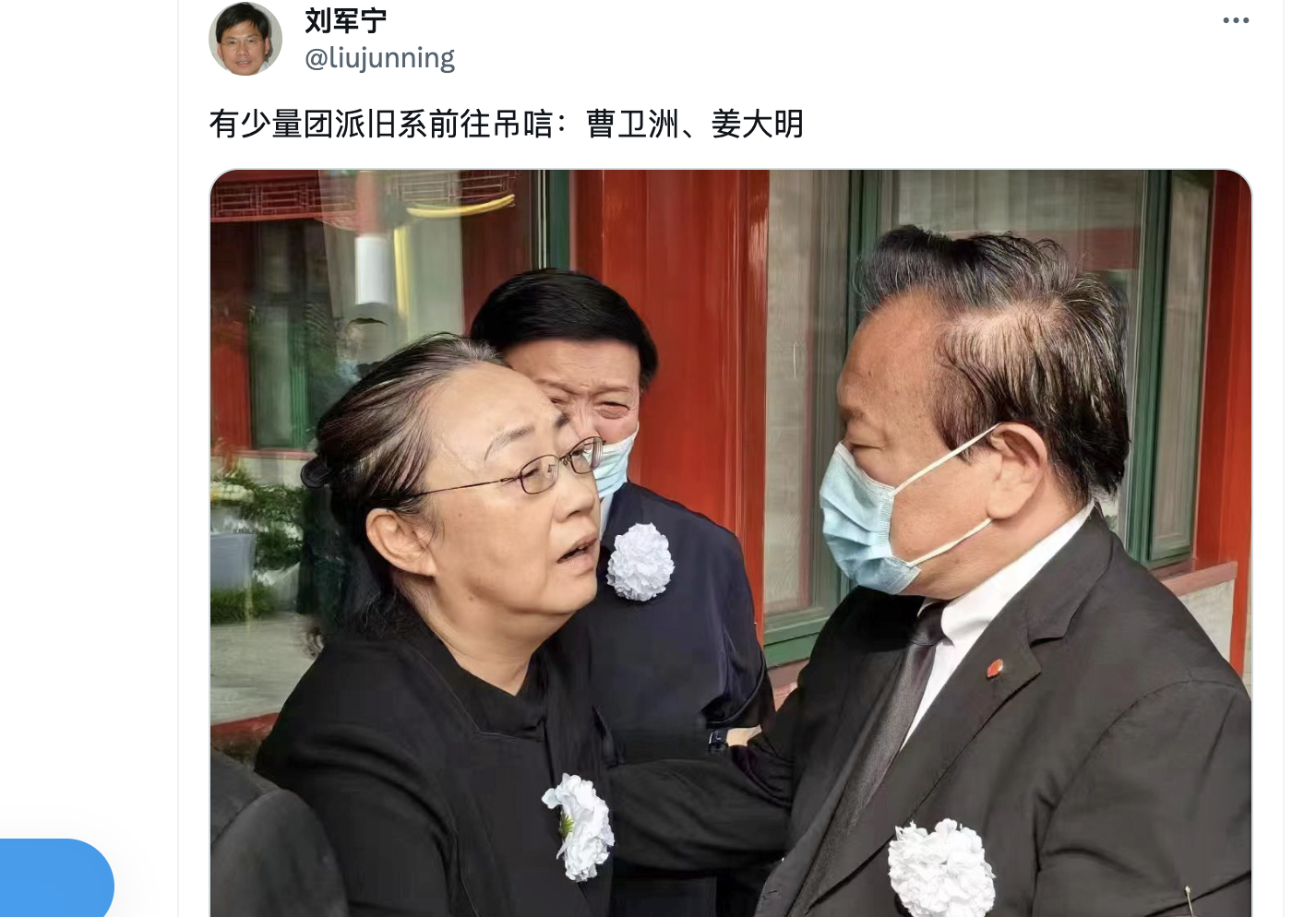網民劉軍寧也貼出程虹接待來客的照片說:「在有少量團派舊系前往弔唁:曹衛洲、姜大明。」照片顯示與程虹擁抱表示慰問的男子戴著口罩,看不清面容。