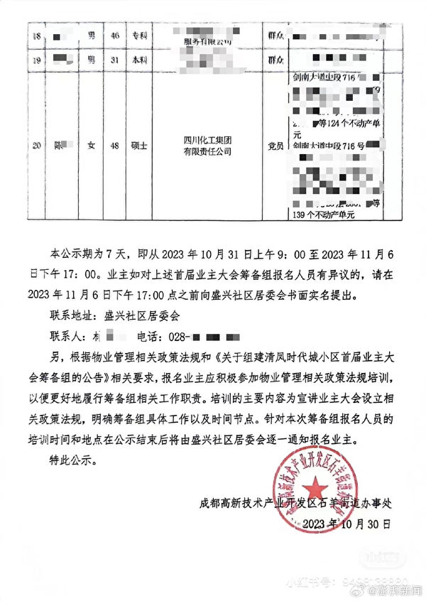 據成都高新技術產業開發區石羊街道辦事處,於10月30日發布的「清鳳時代城小區首屆業主大會籌備組報名人員」公示,四川化工集團有限責任公司一名48歲的陳姓女員工的信息中,包含263個不動產單元。