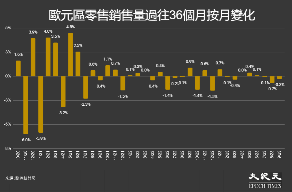 歐洲統計局(Eurostat)於今天(8日)公布最新經季節與工作天調整的零售業銷售初值統計數字,9月份銷售量指數按月錄得下降0.3%,遜於市場所預測的跌0.2%,上月報跌0.7%;若以銷售額計算,則上升0.1%。9月銷量相比上一年同月走低2.6%。