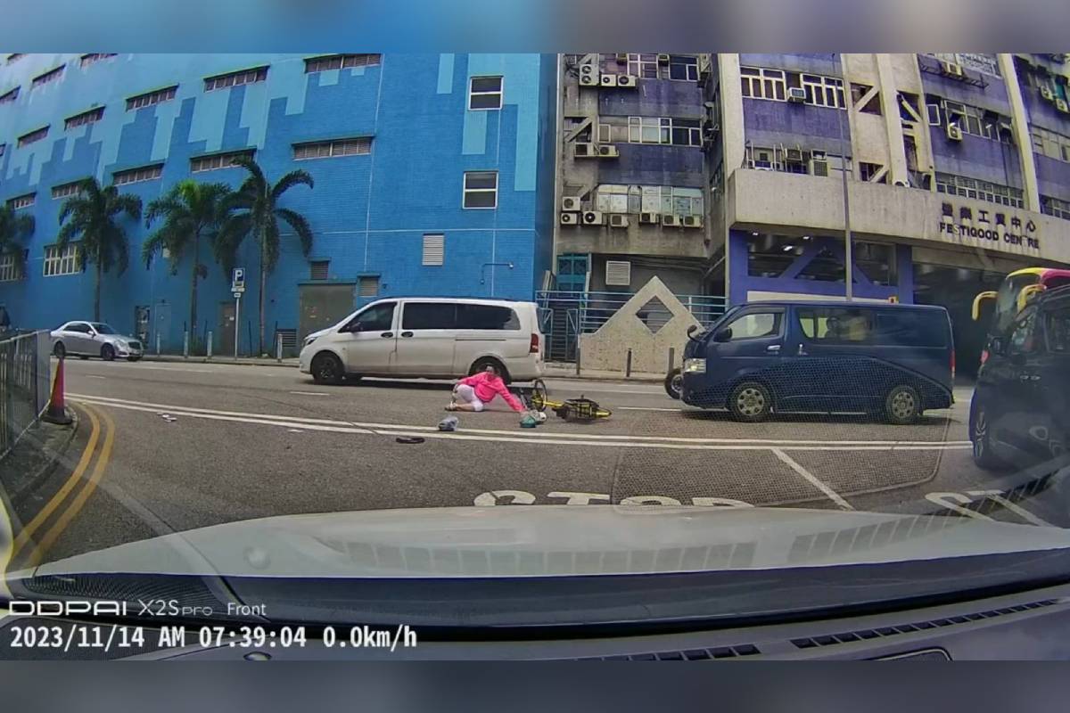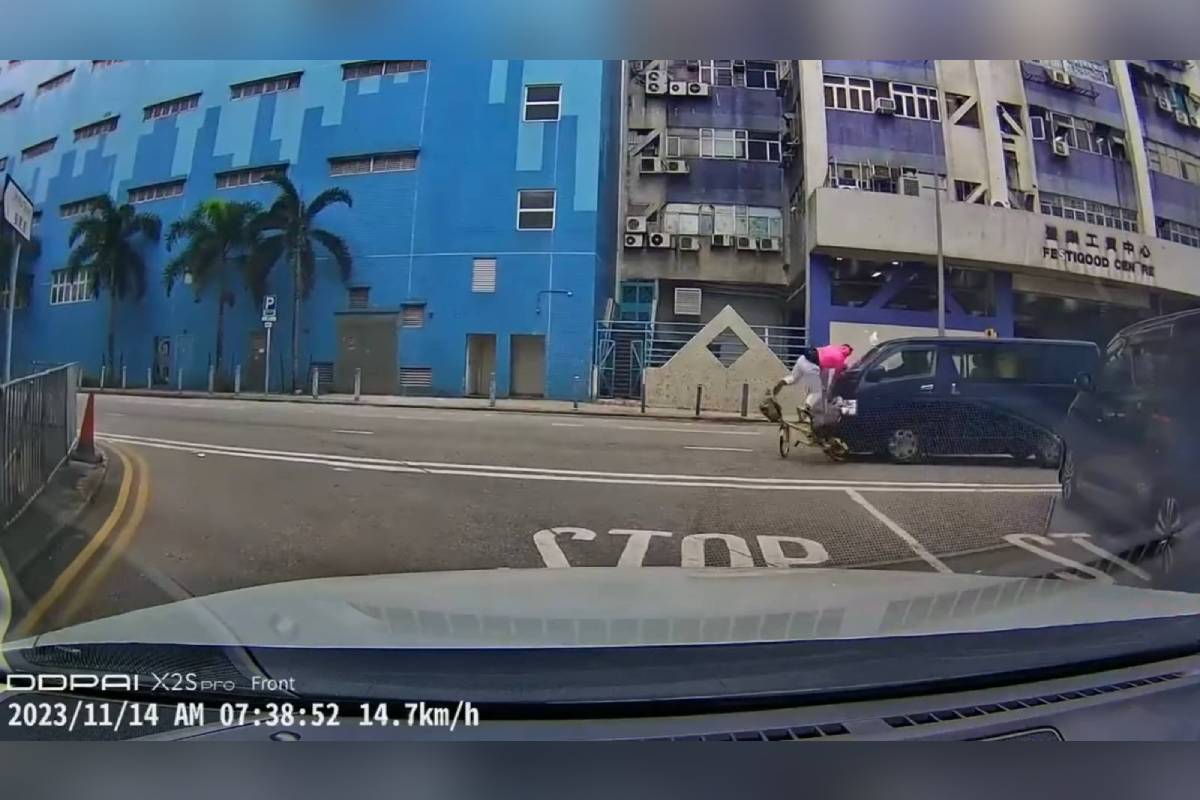 從社交平台上一段車cam影片顯示,現場為粉嶺安居街與樂業路交界,今日上午7時38分左右,一輛單車沿安居街行駛,當駛至樂業路口時,該單車未有依照路面上的停車標示停車,瞬間被一輛駛至的客貨車撞飛,連人帶車凌空飛起再墮地。單車上的雜物散落地上,踩單車的男子慢慢坐起。