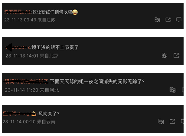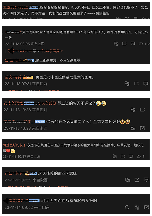 網民紛紛評論,那些五毛黨「領工資的」跟不上節奏了,罵美國的帖子一夜消失了。還有人說,「潑婦怨婦賢婦來回切換」「習維尼既然容不下李克強又豈能容的下美國?」「這都是內宣,忽悠百姓,忽悠核心」「策略性友好。過幾天不友好了,責任全在美方」。