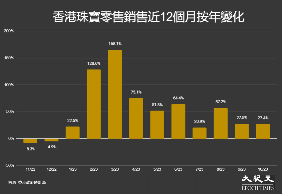 香港政府統計處日前公布最新「珠寶首飾、鐘錶及名貴禮物」(下稱「珠寶」)零售銷售額,10月份報51.0億港元,按年增長27.4%,與上月升27.5%差不多持平,遠超本港整體零售銷售額的按年漲幅5.6%。首10個月累計珠寶銷售額值500.0億港元,與上年同期比較走高55.0%。