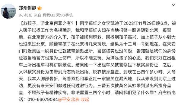 謝靜在所發博文說,從12月1日到現在,「在天安門附近景區一刷身份證就被帶到派出所,警察核實也沒問題,告知就是我們的身份證被當地警方設定為上訪戶,所以不能去玩。為滿足孩子的心願,我們只好在的士上聽的士司機講解景點。結果剛一下的士又被警察攔下核實身份證,之後,又以核實身份為由帶到府右街派出所,脫衣搜身盤查。