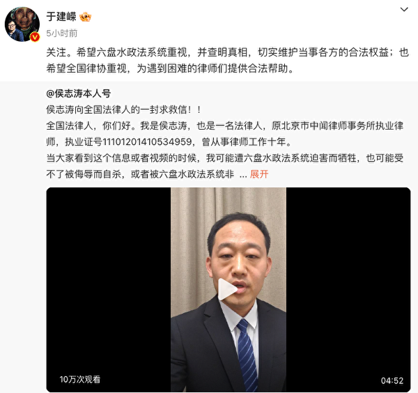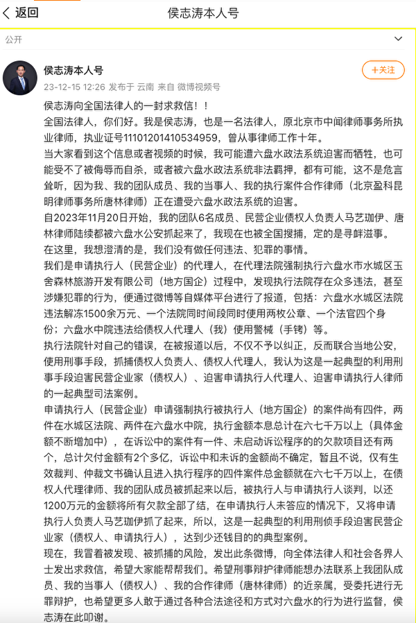 12月15日,前北京市中聞律師事務所執業律師侯志濤在微博發文及發影片求救,他因通過微博等曝光六盤水水城區法院違法解凍1,500餘萬元、一個法院同時段使用兩枚公章、一個法官四個身份,六盤水中院違法給債權人代理人戴手銬等後,本人及團隊正在遭遇六盤水政法系統迫害。