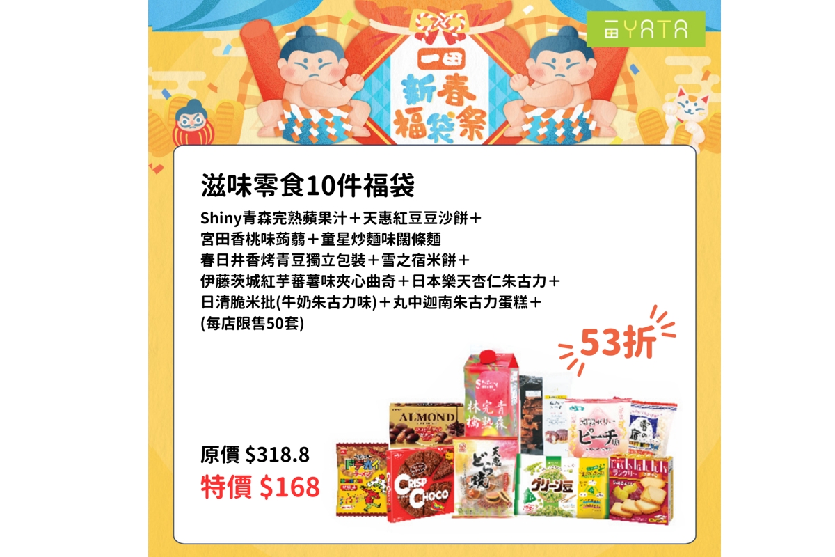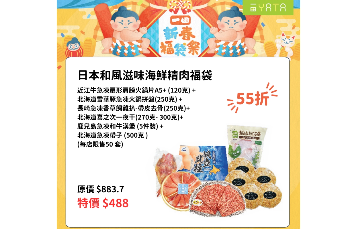 今次「新春福袋祭」一田提供7種福袋,折扣由2折到55折,其中包括多款廚具的「Nippon Kitchen 廚具七寶福袋」和包含衛衣、T恤及折疊杯的「Champion 福袋」低至2折發售;「日本和風滋味海鮮精肉福袋」和「滋味零食10件福袋」分別55折(特價488元)和53折(特價168元),而且兩者均每店限售50套。