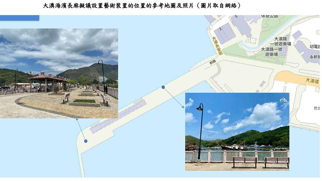 翻查離島區議會文件,該會建議在大澳海濱長廊設藝術裝置,指大澳海濱長廊位於大澳道盡頭西邊的海堤上,連接大澳巴士總站和南涌村,沿途可漫步欣賞紅樹林及漁村風光,是區內熱門的景點,故建議邀請設計師於大澳海濱長廊設置具有地區特色、配合周遭環境並優美雅致的藝術裝置,以提升該景點的吸引力。