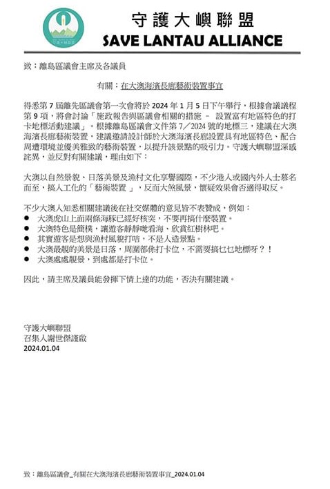 守護大嶼聯盟今日在Facebook上傳一份公開信,表示反對大澳海濱長廊藝術裝置的建議,並提到大澳人對此的意見,包括「大澳最靚的美景是日落,周圍都係打卡位,不需要搞乜乜地標呀?」等。聯盟呼籲新一屆區議會「發揮下情上達的功能」,否決在大澳海濱長廊藝術裝置的計劃。