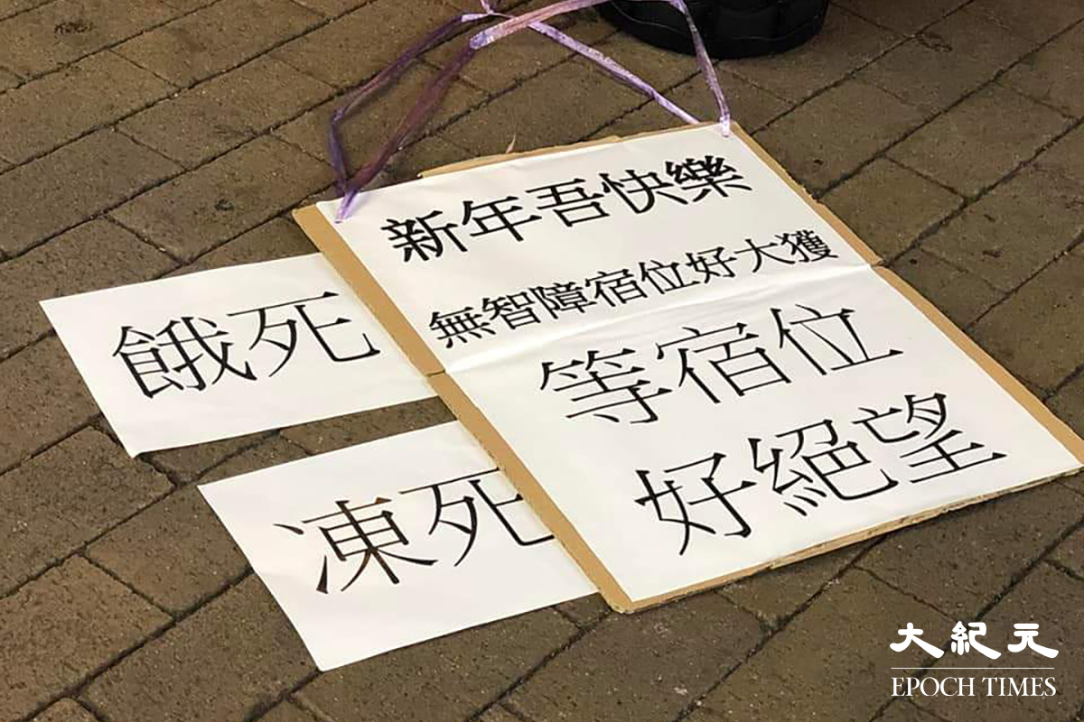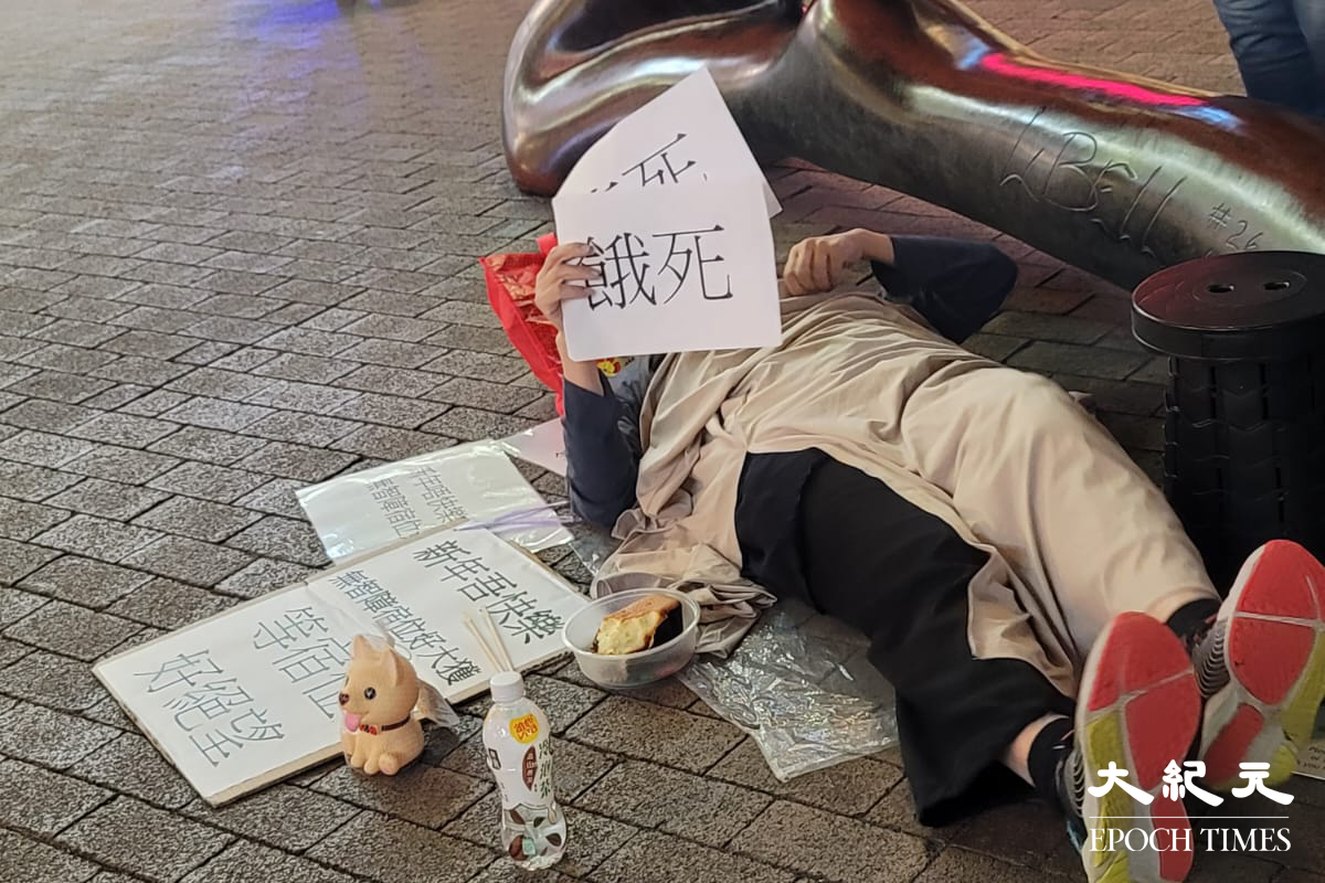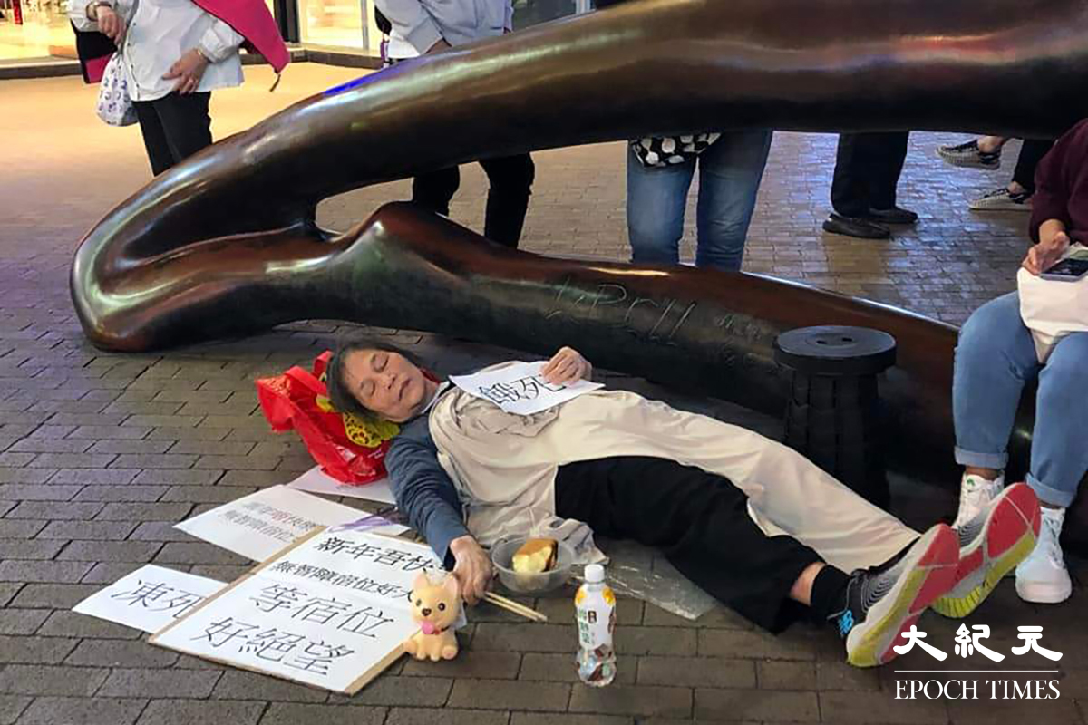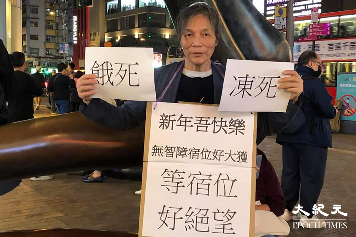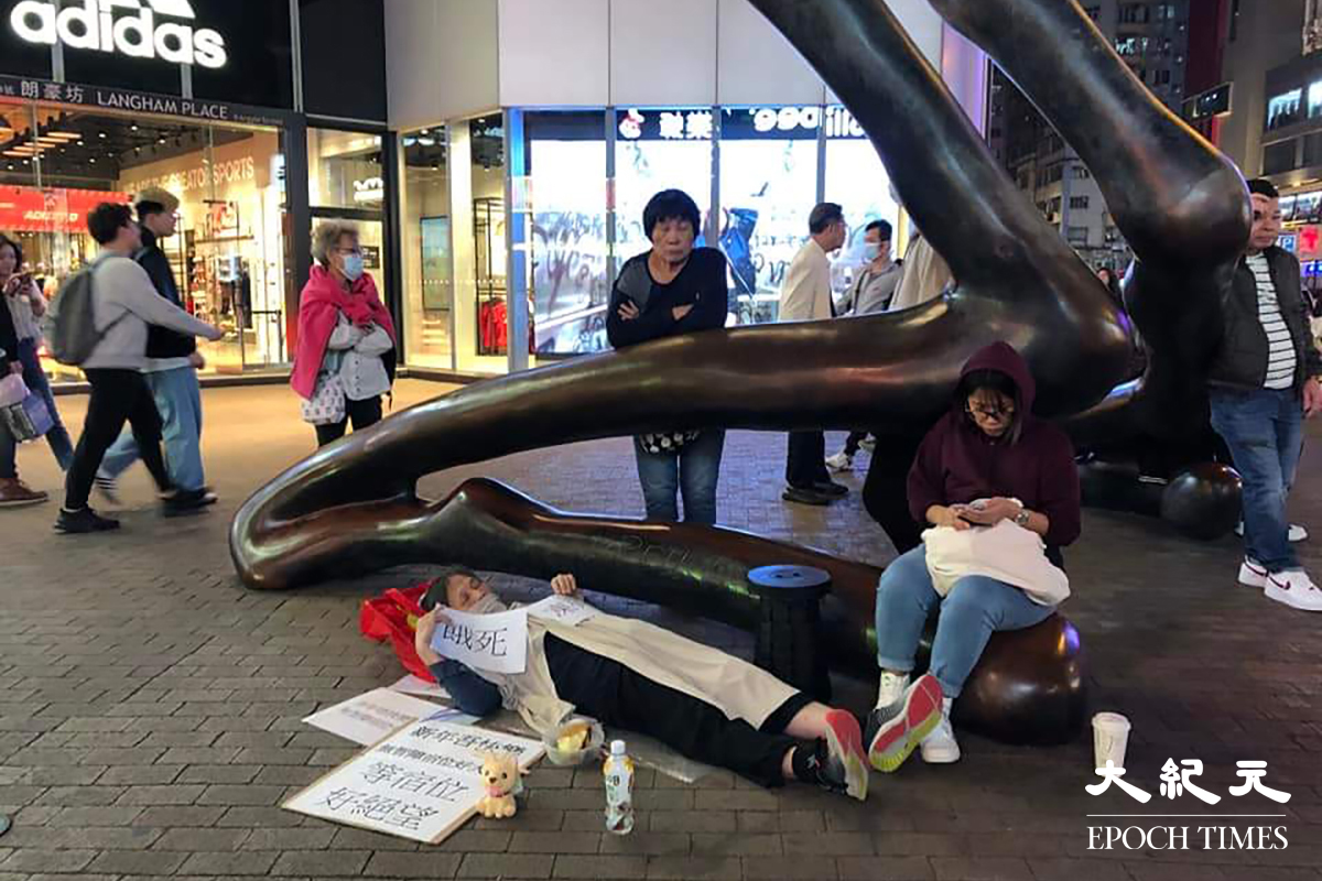 昨日晚上7時左右,蓮姐抵達旺角朗豪坊雕像旁,手持寫有「餓死」及「凍死」紙牌;頸上則掛上寫有「新年吾(唔)快樂 無智障宿位好大鑊 等宿位 好絕望」的大紙牌。為了表達上述訊息,期間她曾躺在地上,希望獲得更多途人關注。