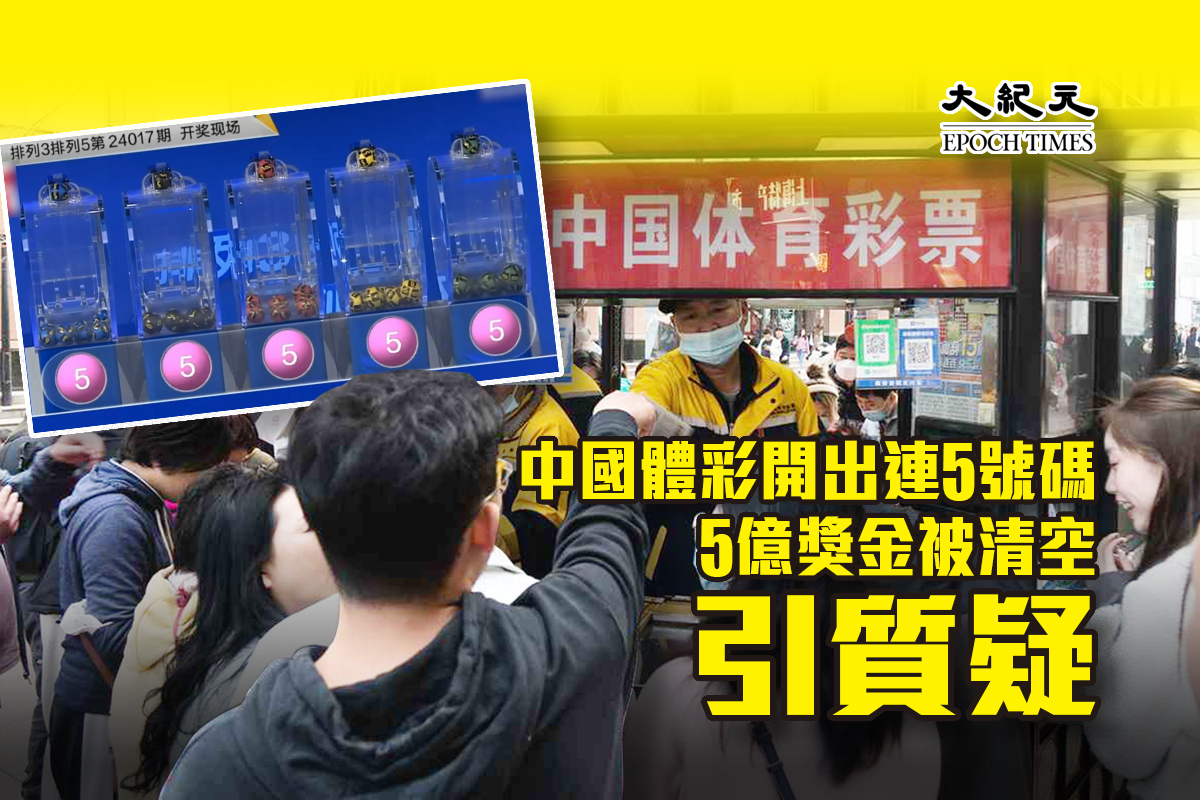 1月18日,中國體彩最新開獎結果再被質疑。17日開獎開出「55555」,5億元(人民幣,下同)獎池被清空。中國體彩稱不存在人為操控等。但網民紛紛不相信此說法。