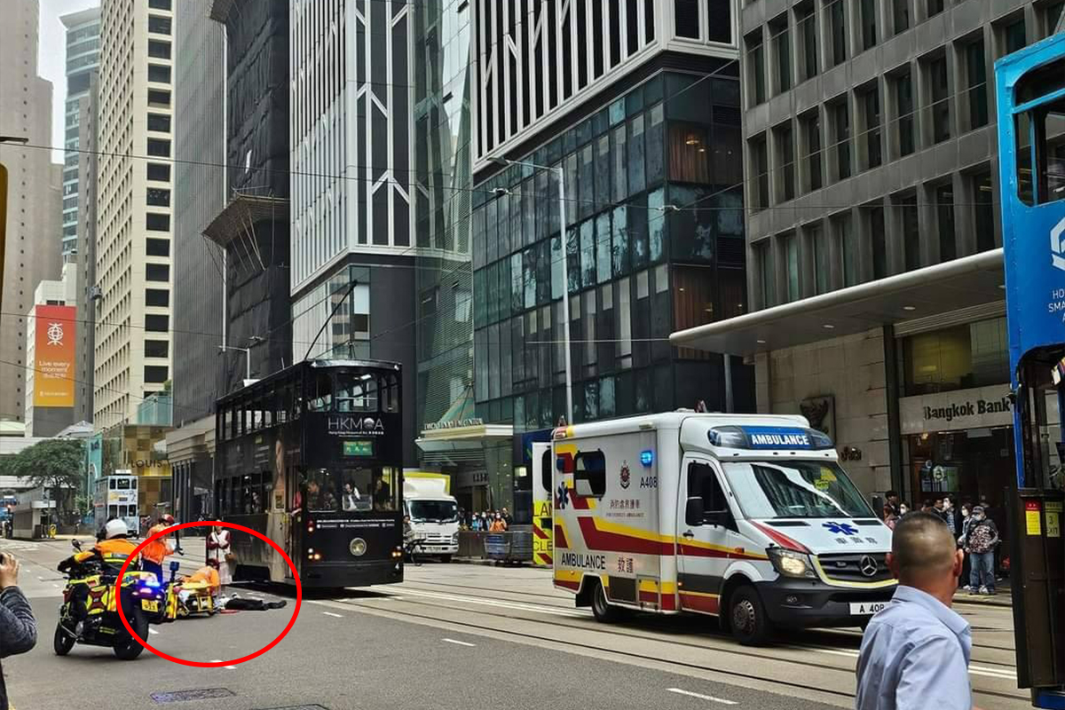 現場為中環德輔道中東行、華懋中心2期對開,今日早上11時許,30餘歲女事主在上址過路期間,遭一輛駛至電車撞倒,隨即倒地陷入半昏迷。救援人員到場,將事主送往瑪麗醫院搶救。@