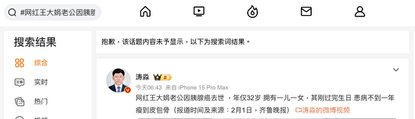大紀元記者2月2日在微博搜索話題「#網紅王大娟老公因胰腺癌去世#」,顯示「該話題內容未予顯示」。但微博上相關消息還在。