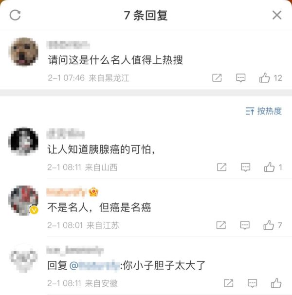 有微博網民疑惑地詢問:「這也能上熱搜!」「發生甚麼(大)事了嗎?」「這個熱搜有點詭異,莫名成頭條了!」「請問這是甚麼名人值得上熱搜?」有網民則委婉地回覆:「不是名人,但癌是名癌。」另一名網民馬上提醒:「你小子膽子太大了。」