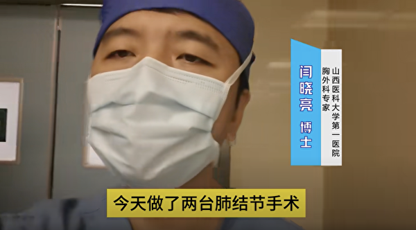 2月1日的影片中,閆曉亮說,「今天做了兩台肺結節手術,一台提示是一個簡潤性腺癌……另一個病人提示是一個微緊韌癌。這兩個病人都是在體檢過程中發現的肺結節。」