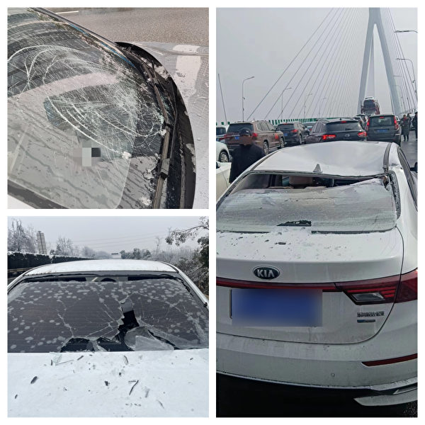 目擊現場狀況的網民稱,有車輛的車頂和玻璃被砸爛,甚至車頂的高強度鋼橫樑都被砸彎,冰塊比磚頭都大。