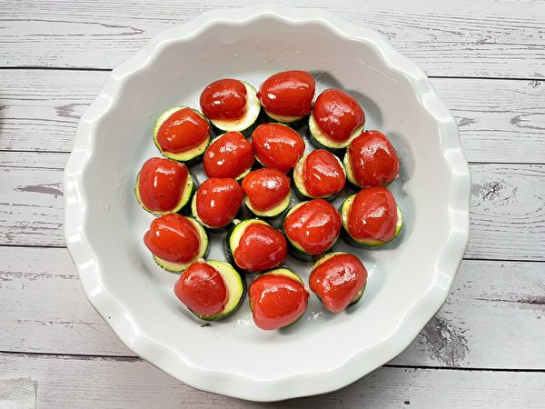 4.先將翠玉瓜擺入烤盤,再把番茄(切面朝下)擺在翠玉瓜上面,碗中剩餘調味料塗抹在番茄和翠玉瓜中間。