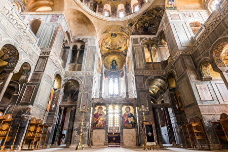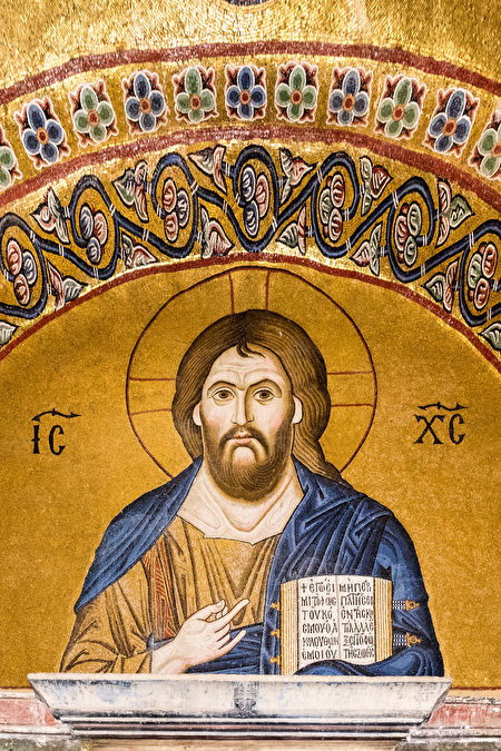 走進卡托利孔教堂,你會先經過一座大型的鍍金馬賽克基督像,拜占庭人稱之為Pantocrator,意思是「全能的統治者」或「所有人的統治者」(all-powerful ruler or ruler of all)。馬賽克以黃金鑲嵌(gold tesserae),呈現基督身穿藍色披風抱著一本翻開的書,宣稱自己是「世界之光」(約翰福音8:12)的圖像。中世紀拜占庭教堂經常用黃金做鑲嵌,以非常細緻的金箔貼在兩塊透明或淺色玻璃中間。