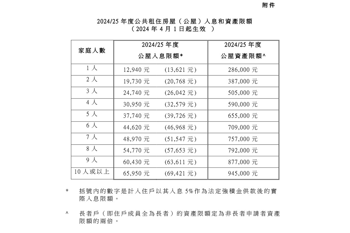 根據房委會提供的資料,2024/25年度,一人家庭的公屋入息限額為12,940元,資產限額為286,000元;二人家庭的公屋入息限額為19,730元,資產限額為387,000元;三人家庭的公屋入息限額為24,740元,資產限額為505,000元。(詳見圖)。@
