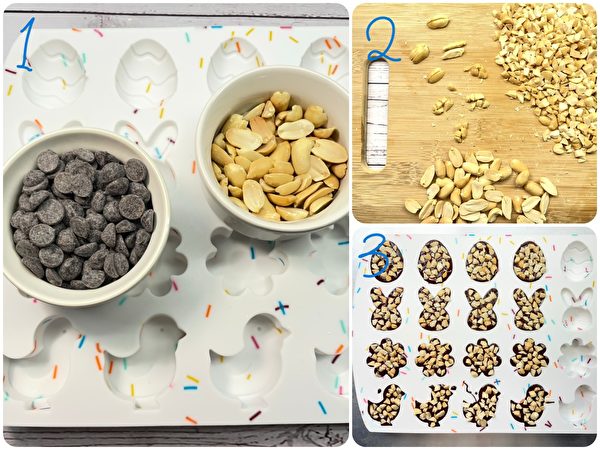 手作花生朱古力只需要購買朱古力和烤花生兩種食材。小朋友可以幫忙將融化的朱古力液注入矽膠模具,最後鋪滿香噴噴的烤堅果。朱古力若用錫箔紙包裝擺入禮盒更添節日氣氛。