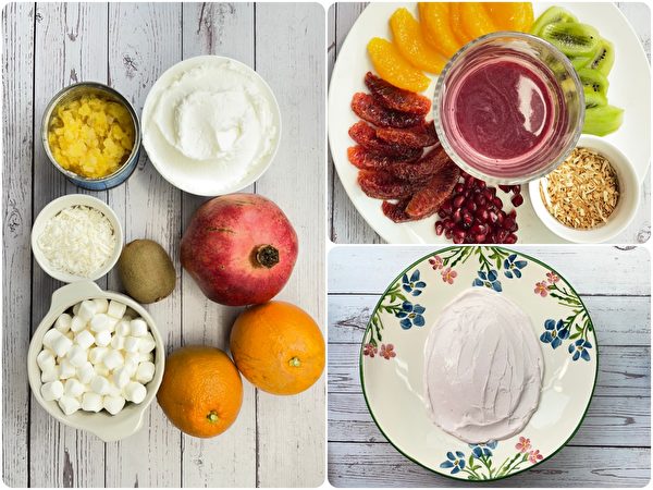 乳酪混合石榴汁(新鮮石榴汁也可以煮成糖漿使用),在碗裏鋪一個蛋的形狀,用水果和棉花糖裝飾即可。