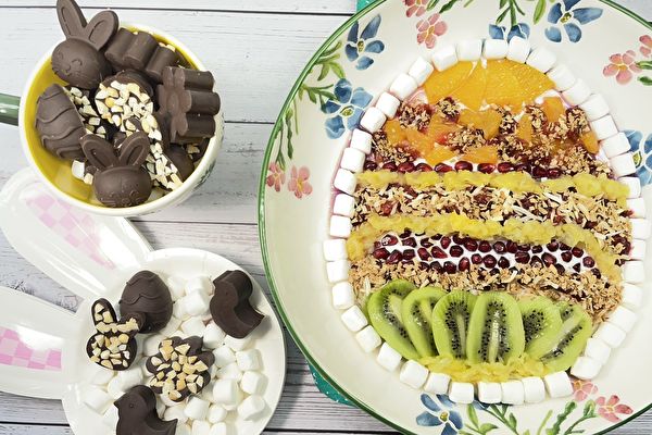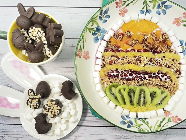 等待朱古力凝固的空檔可以製作彩蛋果盤。我們的彩蛋果盤是乳酪和健康水果組成的美味甜食,創意靈感來自Ambrosia。Ambrosia是一種美國南方風格的水果沙律,食材組成包括顏色鮮豔的水果、迷你棉花糖等,通常在節日享用。