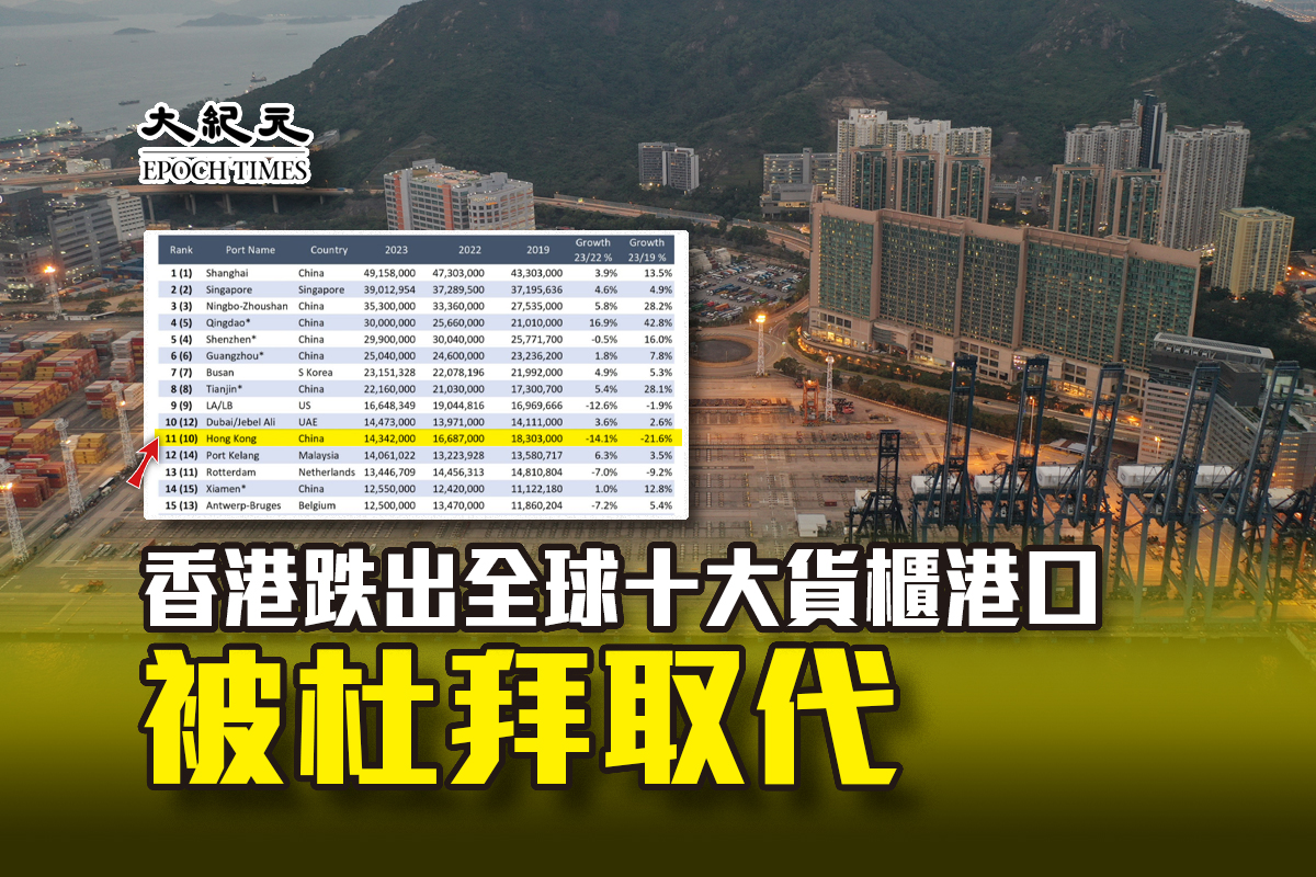 據航運傳媒The Loadstar昨日報道,香港去年港口吞吐量下降14.1%至1,430萬個TEU(標準貨櫃),形容這標誌香港貨櫃碼頭的長期衰退。而杜拜碼頭則超越香港成為世界第十。榜首則仍是上海,其次是新加坡和寧波。至於鄰近香港的深圳則排第五。