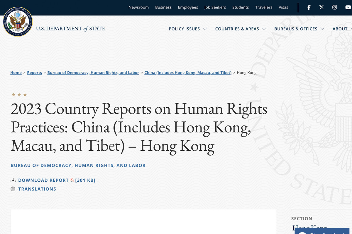 美國國務院在報告中對香港人權問題提出關切,指中共違背《中英聯合聲明》和《基本法》的承諾,繼續剝奪香港的政治自由和自治權、不合理地逮捕或起訴記者、對政治參與有嚴重和不合理的限制、以及公民無法透過自由和公正的選舉和平地改變政府等。