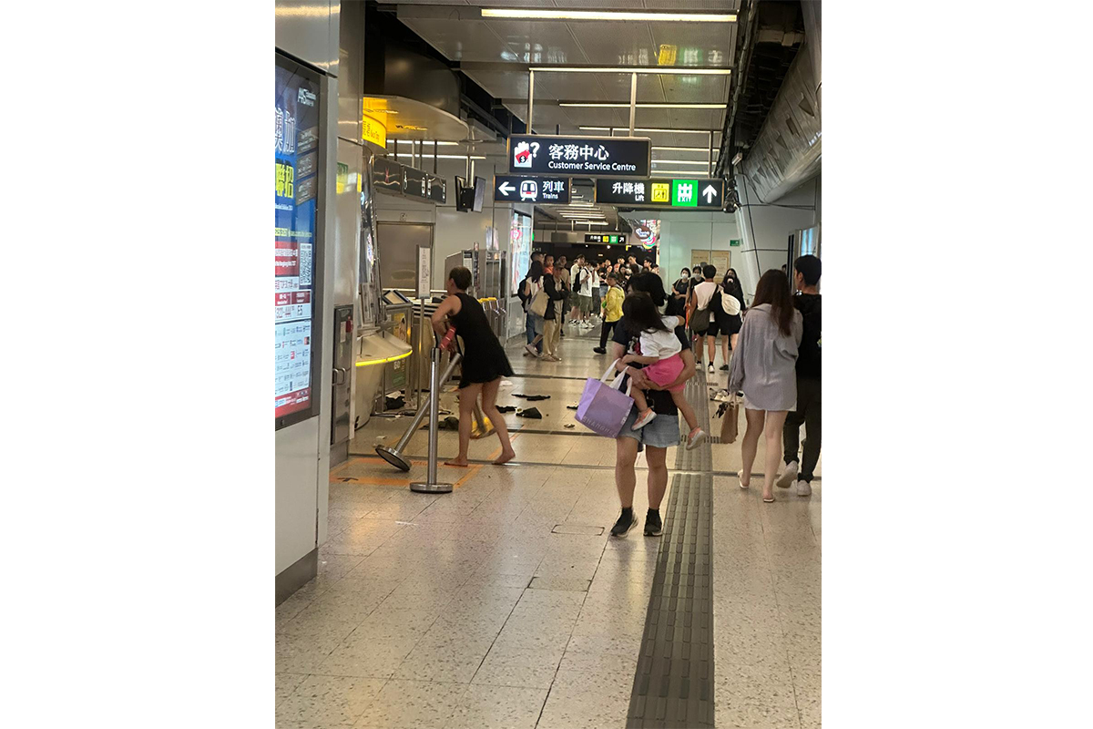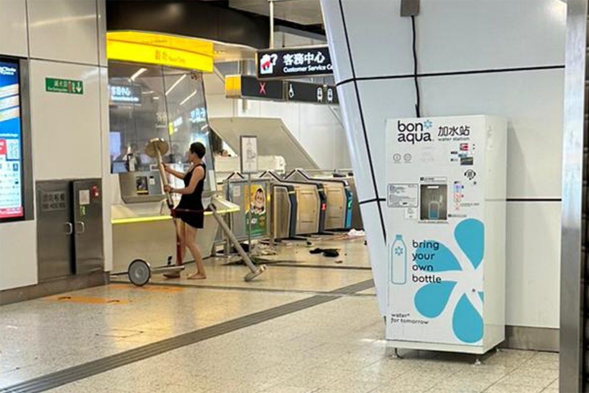相關網上照片顯示,一名身穿黑色連身短裙、沒有穿鞋的女子在觀塘港鐵站閘外,拿起排隊欄杆拉帶柱撞擊客務中心的玻璃。附近有其他欄杆拉帶柱倒下,入閘機外地上滿是垃圾,場面頗為混亂,亦有乘客在旁邊圍觀,但照片並沒有拍攝到港鐵員工。