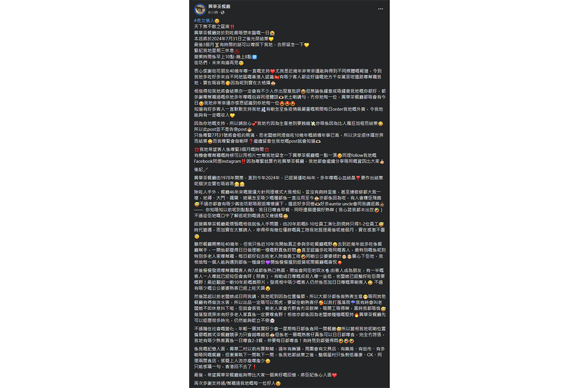 距離興華茶餐廳正式結業餘下約3個月時間,餐廳表示歡迎大家在這段時間內光臨,又希望客人能夠為餐廳的一點一滴拍下照片作為紀錄。帖文又表示,餐廳的Facebook和Instagram專頁未來仍然會繼續運作,向大家分享不同資訊。