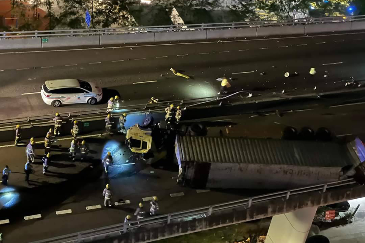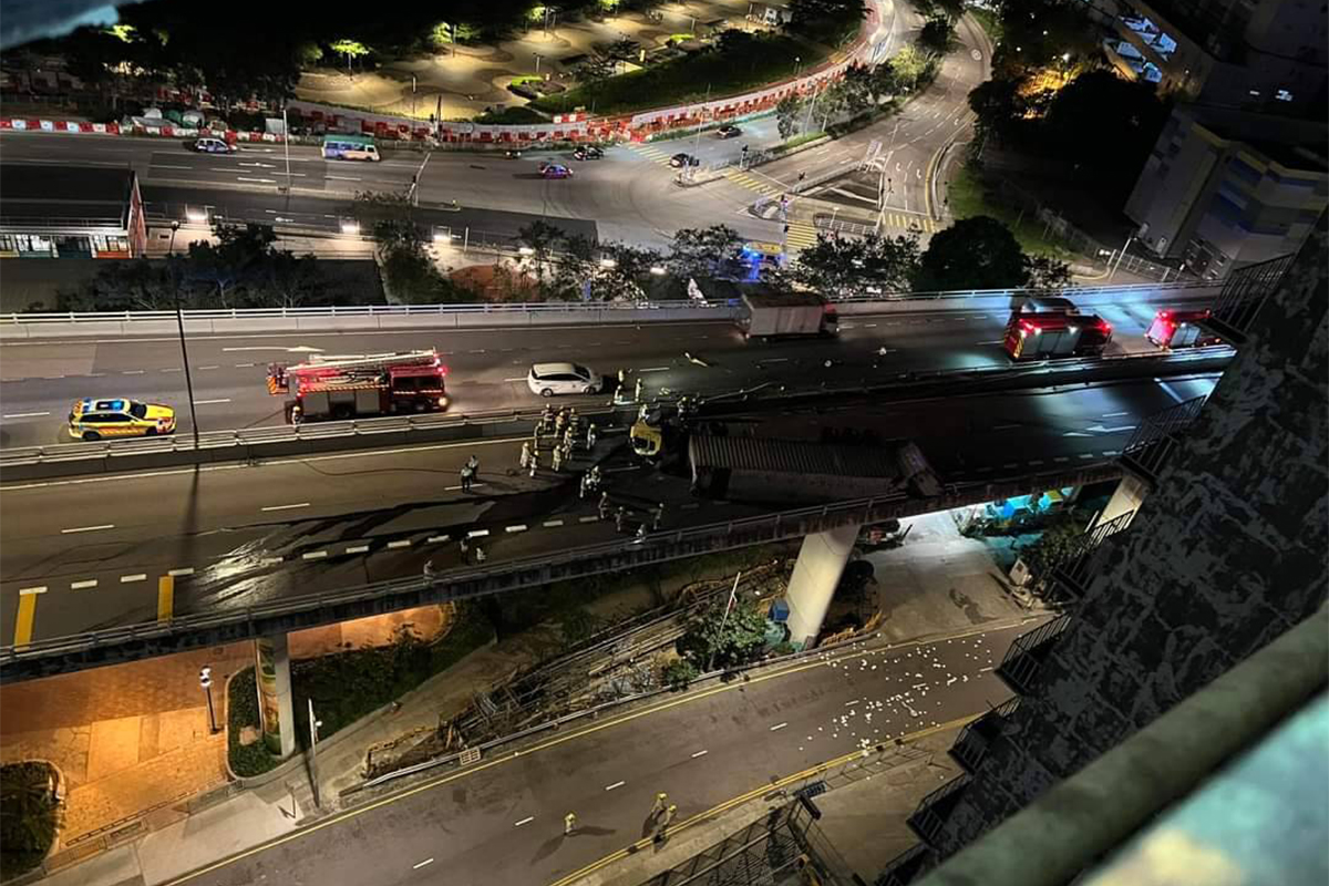 從網上影片可見,事主所駕駛的貨櫃車駛至上址時,先失控撞向左邊石壆,再反彈撞向右邊石壆及欄杆並翻側,撞毀多支燈柱及欄杆,期間車頭被劏開,六旬司機遭拋落橋底慘死。意外後,肇事貨櫃車橫在路中,車頭嚴重損毀,零件及雜物散落一地。