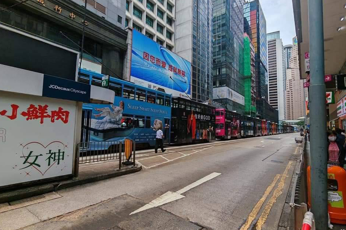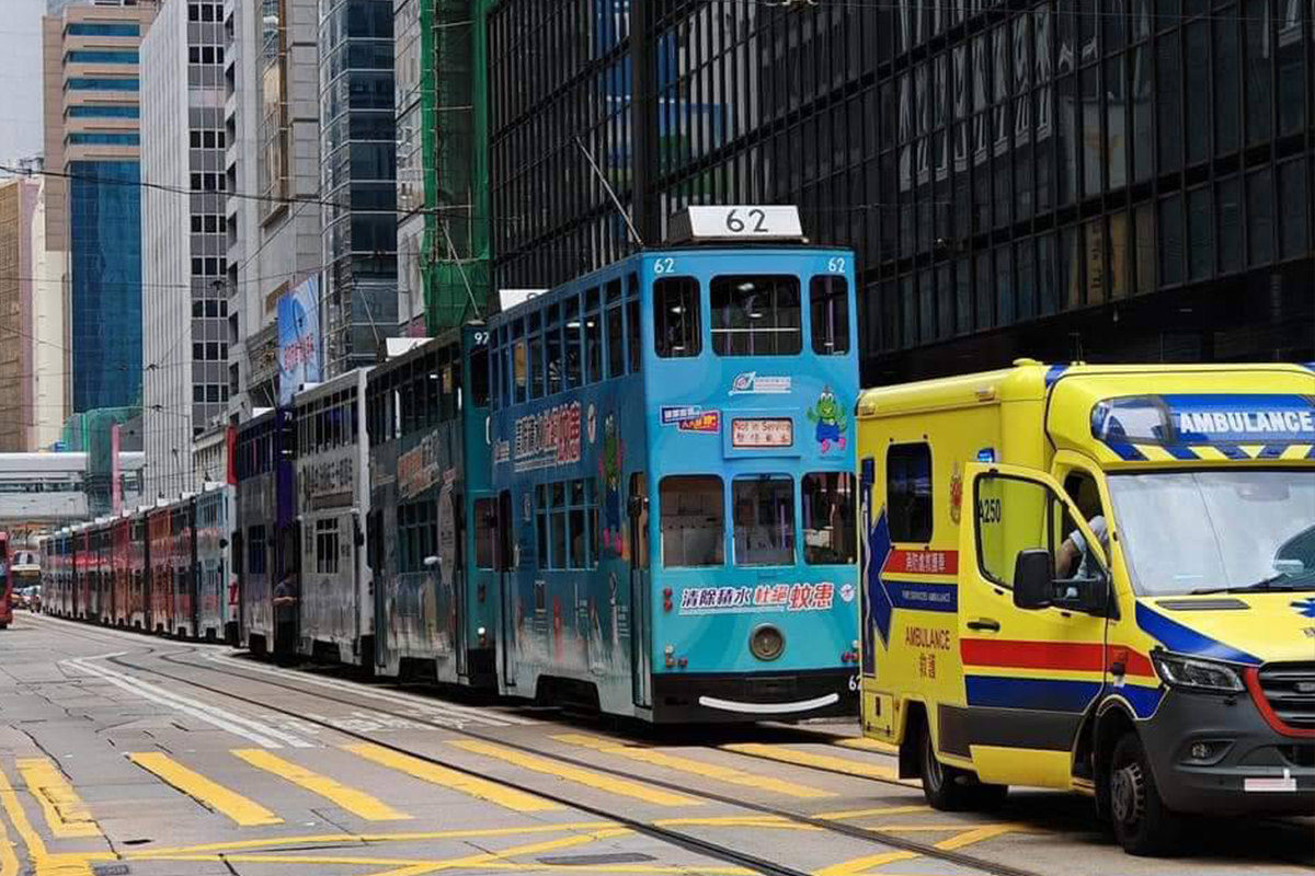 今日下午1時左右,一輛電車沿德輔道中往東行駛。當電車駛至畢打街對開時,一名53歲鄧姓婦人突然在電車梯間摔倒,她頸部受傷,其後經救護車送瑪麗醫院治理。受事故影響,上址電車一度停駛,現場出現長長車龍。@