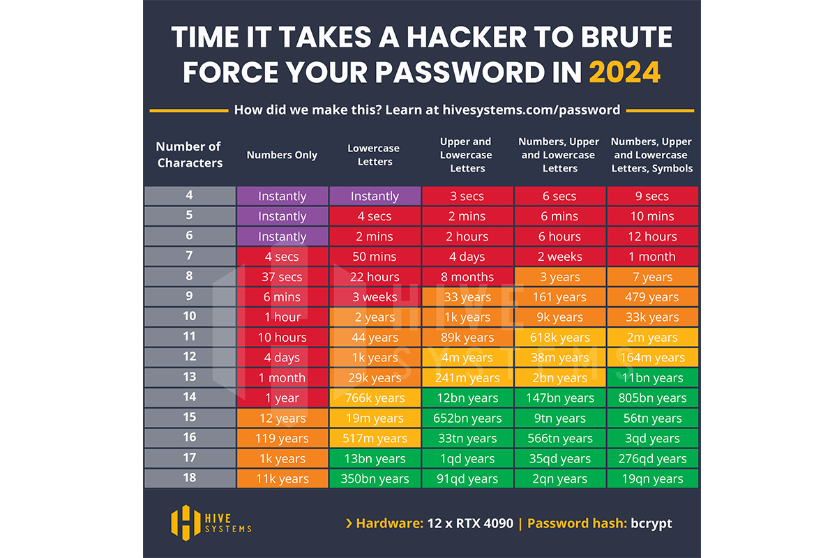 Hive Systems表示,許多網站目前要求設定至少8字元的密碼,須含字母、數字或符號,而在最新的評估報告顯示,假如用戶單純以數字組成密碼的話,4至6位數字可以即時被黑客以「蠻力」破解、8位數字密碼的破解速度為37秒、即使長達10個位的數字組合亦只需1個小時。