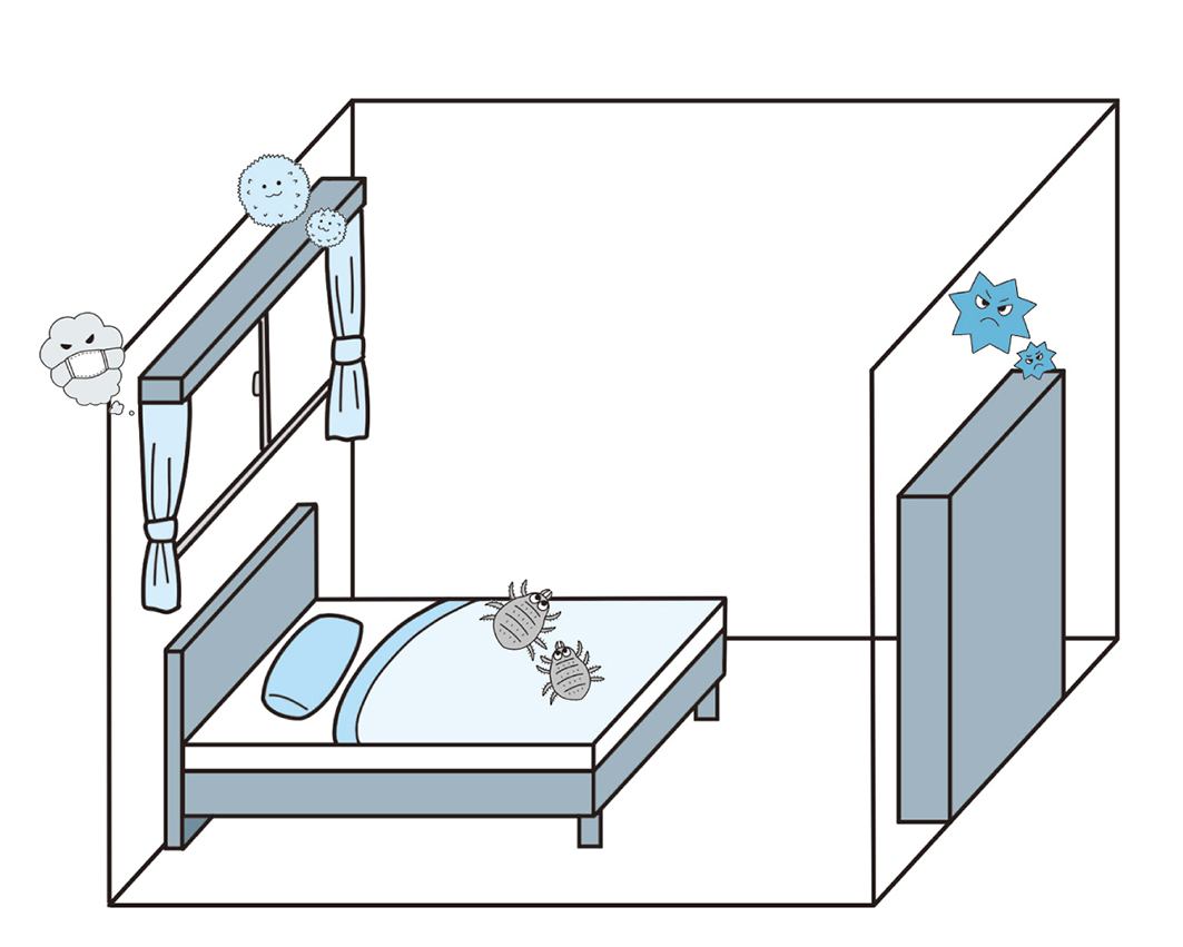 房間床鋪的周圍,存在著許多一年四季都必須小心留意的病原體,像是流感病毒、花粉、PM 2.5 、塵蟎……等等。由於寢室高處的灰塵,會含有粒子較輕的流感病毒、花粉或PM2.5懸浮微粒等病原體,所以打掃寢室的第一步,就是先拿化纖除塵撣,輕輕地清潔過位置較高的平面。