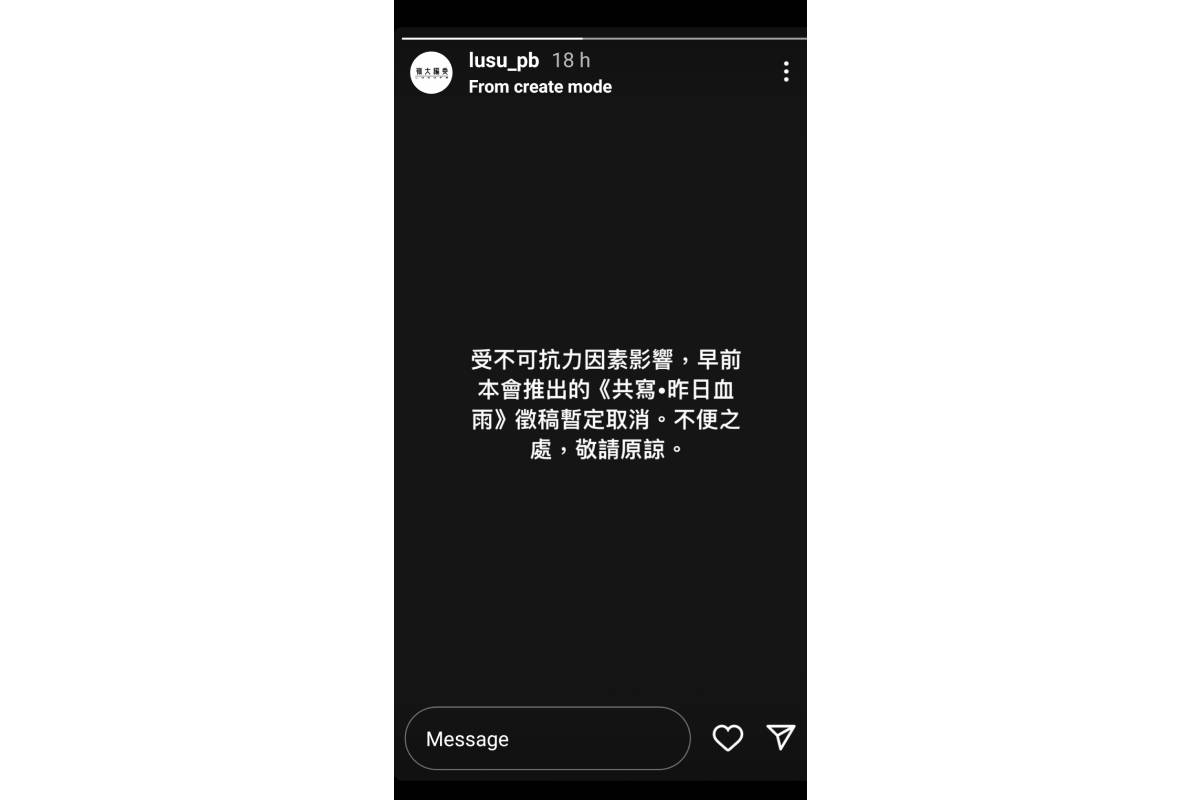 昨日,嶺大編委在Instagram發出限時動態,稱「受不可抗力因素影響」,該徵稿活動暫定取消,但未有透露具體原因。本報記者翻查嶺大編委的社交媒體,發現徵稿活動的宣傳帖文已被下架。