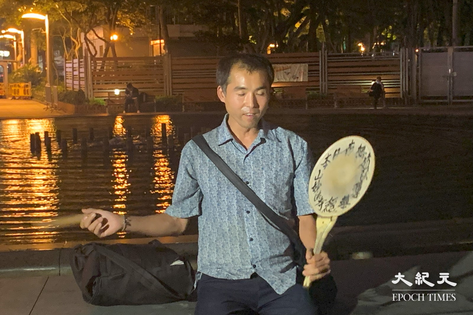 自稱為作家、43歲的日本人飯村行雄,晚上10時許在鳴擊寫扇鼓誦經,緩緩步入維園,還不時邀請途人一同跟隨音樂拍打節奏。飯村先在維園天后入口被警方截查近3分鐘,翻閱其背包所有書籍、食物及隨身物品。他憶述警方在搜身其間沒有查看其護照,但登記了酒店地址,無有收到任何警告及呼籲。