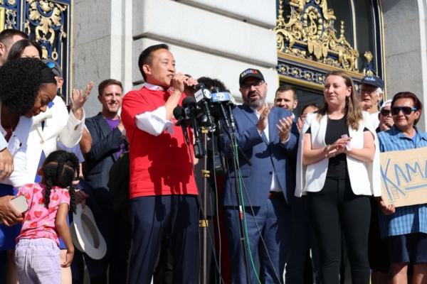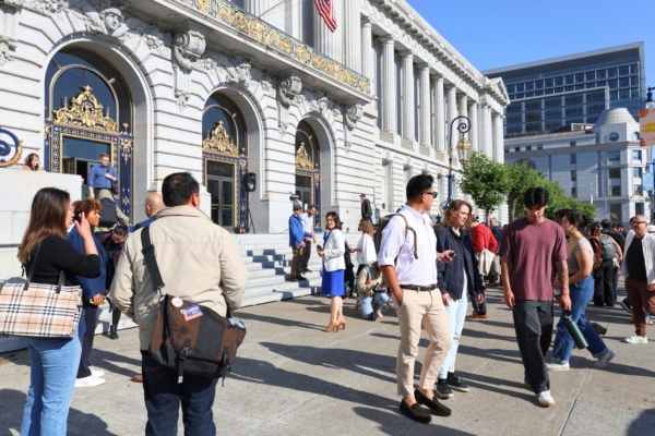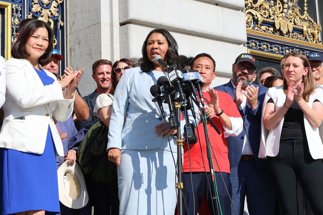 2024年7月21日,拜登總統宣布退選,並支持副總統賀錦麗(Kamala Harris)成為民主黨總統候選人。7月22日,三藩市民主黨領袖在三藩市市政廳門前集會,支持賀錦麗參選。
