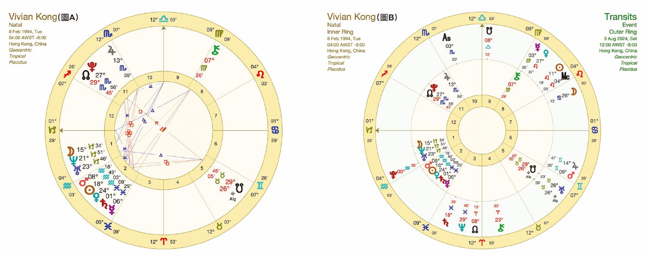 結合今年8月3日的星盤與她的出生盤形成合盤(圖B),有以下觀察:
