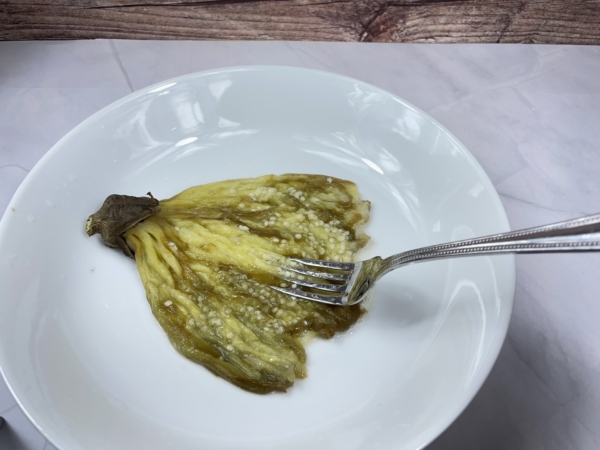3. 茄子烤好,撕掉外皮,用叉子順著茄肉紋路壓成扁片。(如下圖)