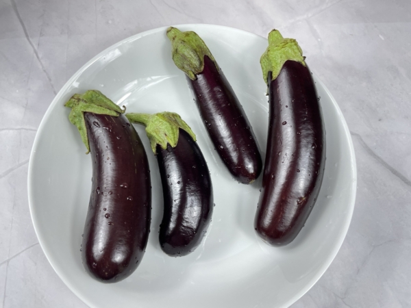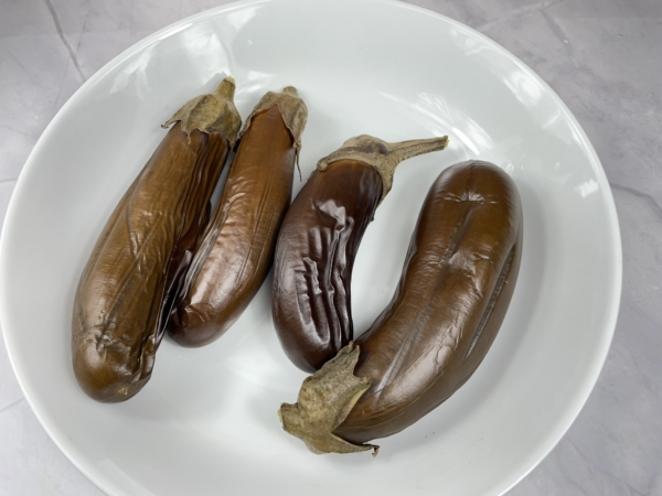1. 茄子洗淨,整個放入電焗爐,用灸烤功能(broil)以450華氏度烤20分鐘。當茄子外皮變褐、捏上去熟軟就取出。如果茄子大小不一,先取出烤好的小茄子,大茄子繼續烤熟。