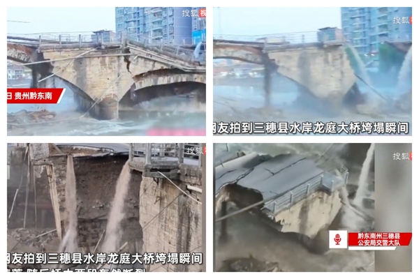 日前,貴州黔東南三穗縣水岸龍庭大橋瞬間垮塌,橋中兩段轟然斷裂。此前一天,大橋橋面已開裂。