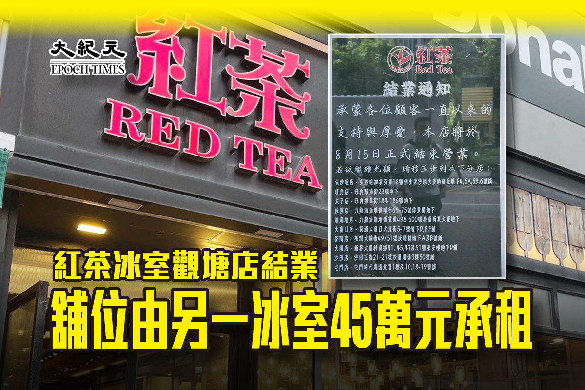 全港設有多間分店的茶餐廳「紅茶冰室」,其觀塘分店早前宣布今日(15日)結束營業,不少市民趁最後一日營業排隊光顧。據報稱該舖位今年逆市加租6.6%至每月60萬元,最終令紅茶冰室未能留守;最新消息稱舖位已獲另一間擁有多間分店的「檸檬冰室」承租,租金大幅降至45萬元。