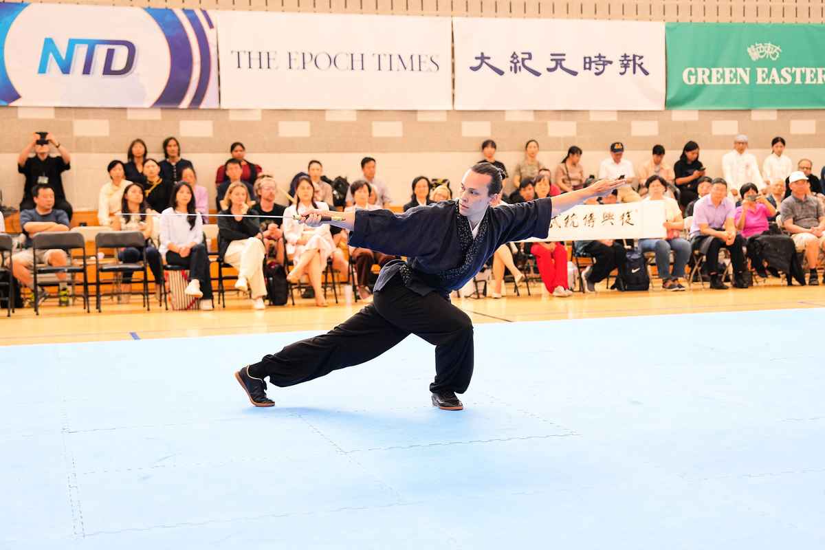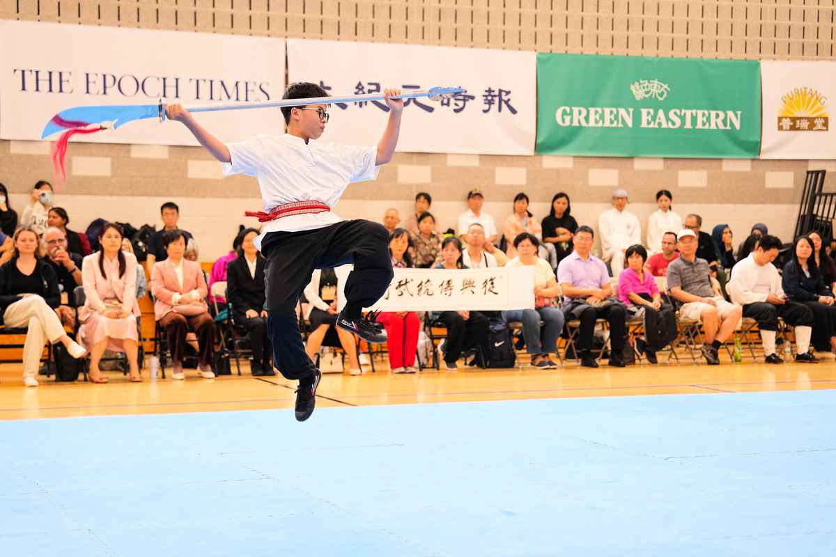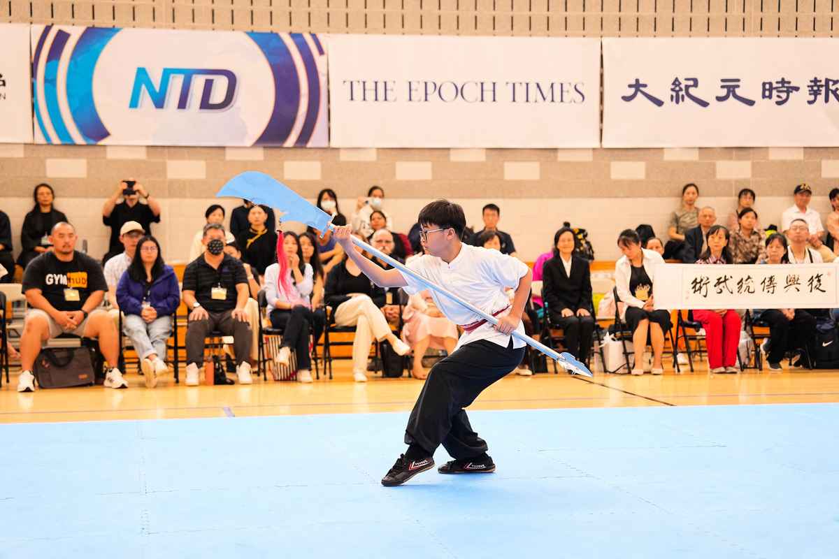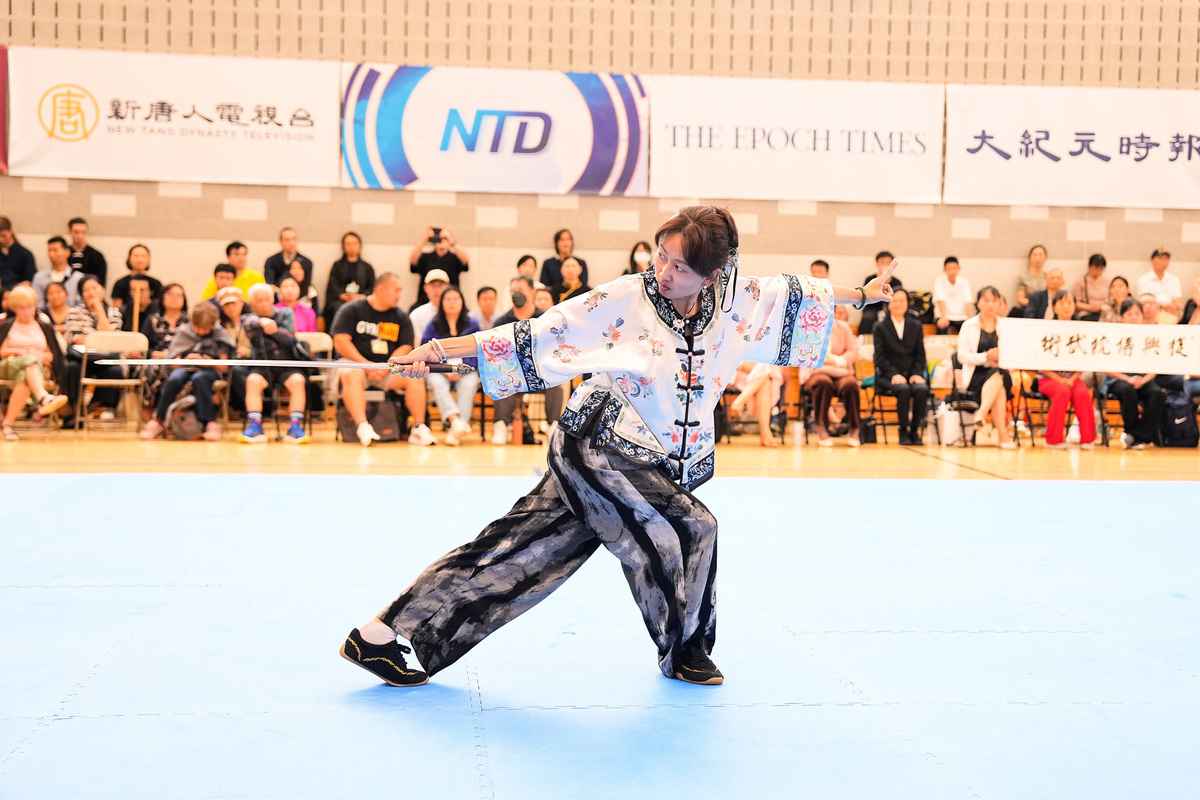2024年9月2日,第八屆新唐人全世界中華傳統武術大賽在美國新澤西州沃爾德威克(Waldwick)舉行決賽。圖為美國選手馬里奧‧薩拉查(Mario Salazar)在男子器械組比賽中表演少林羅漢醉劍。(戴兵/大紀元)