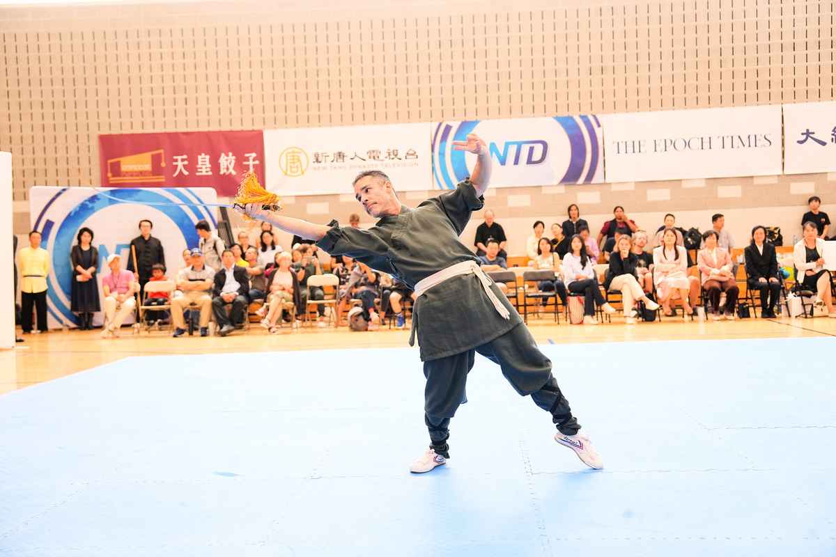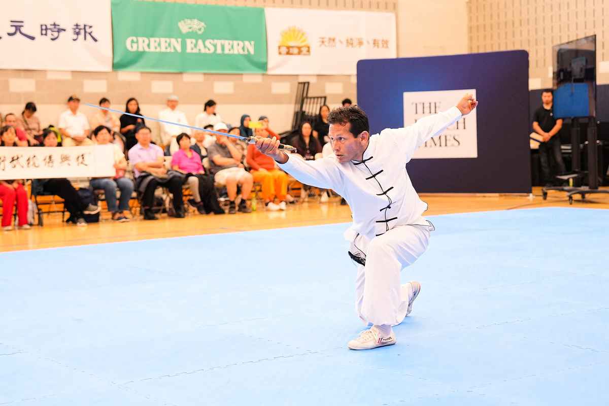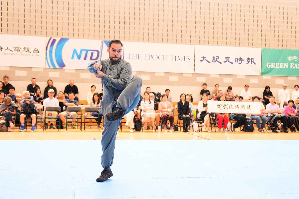 2024年9月2日,第八屆新唐人全世界中華傳統武術大賽在美國新澤西州沃爾德威克(Waldwick)舉行決賽。圖為哥倫比亞選手莫里西奧‧平松(Mauricio Pinzon)在男子器械組比賽中表演七星連環劍。(戴兵/大紀元)