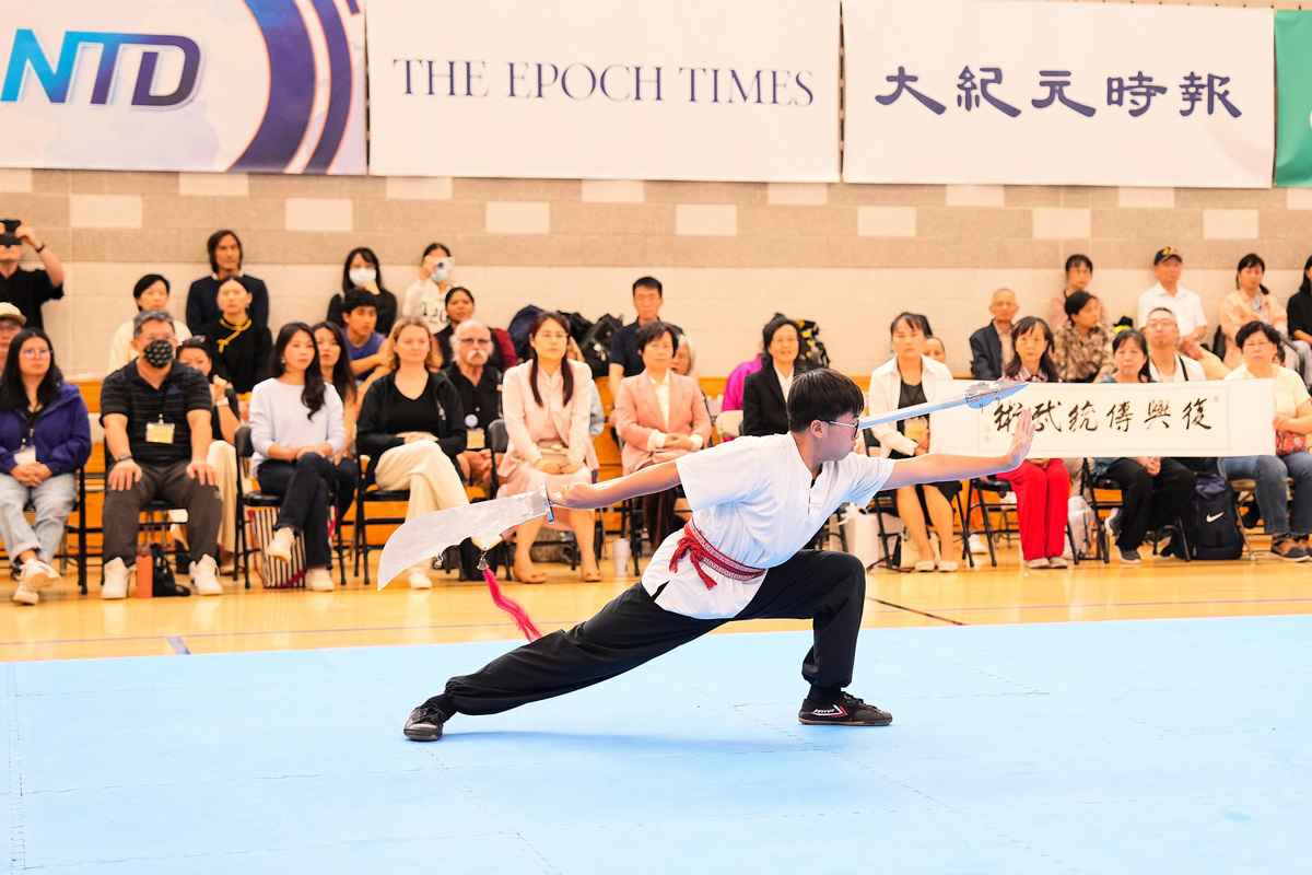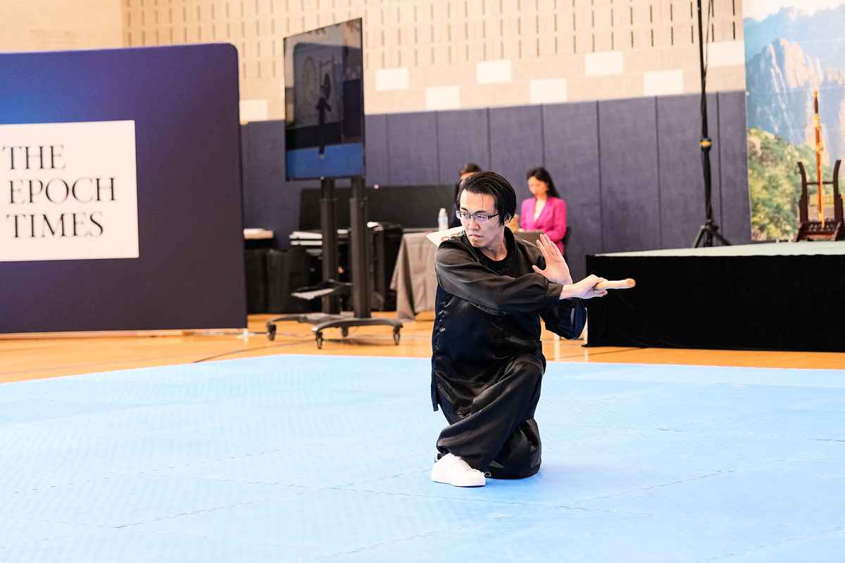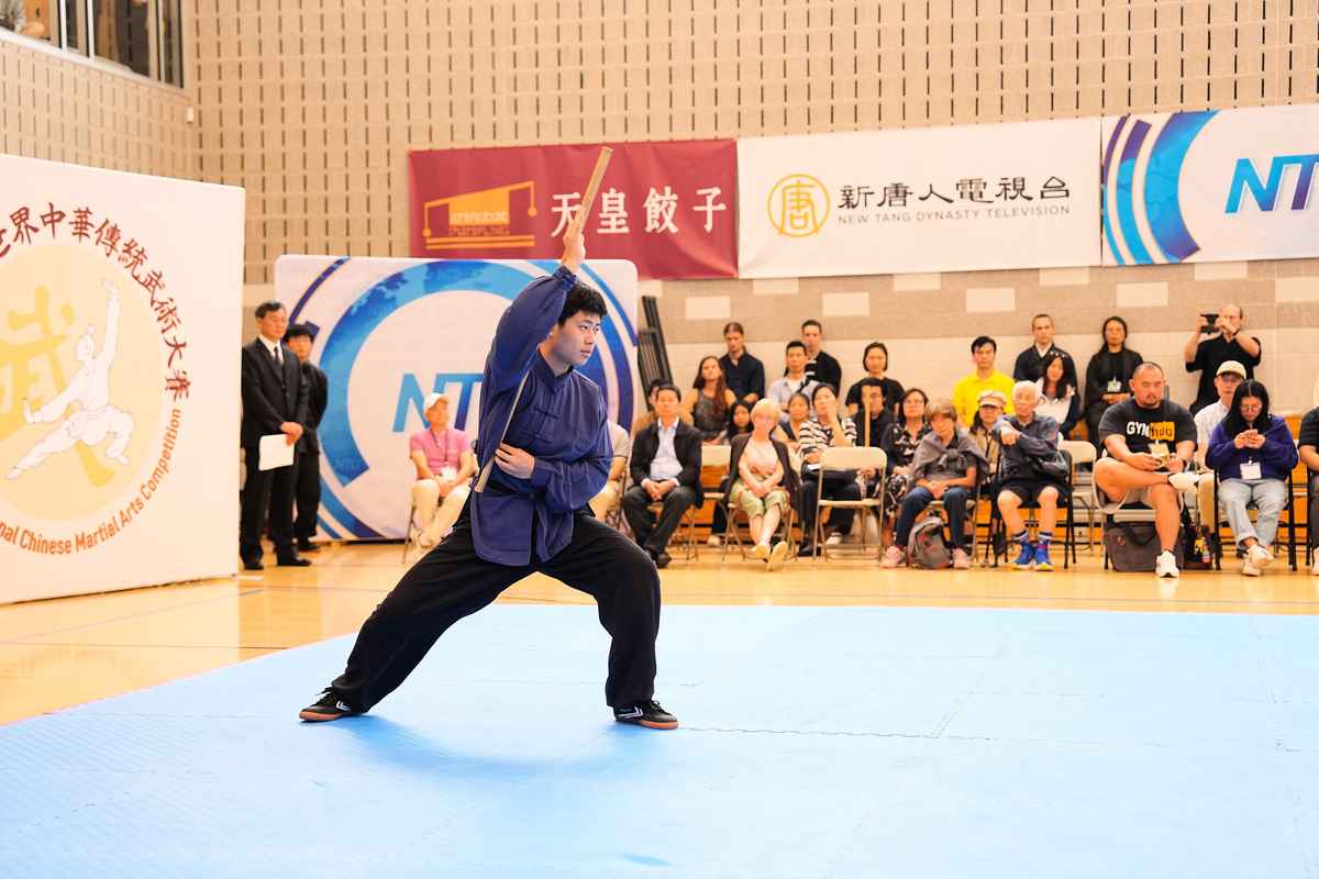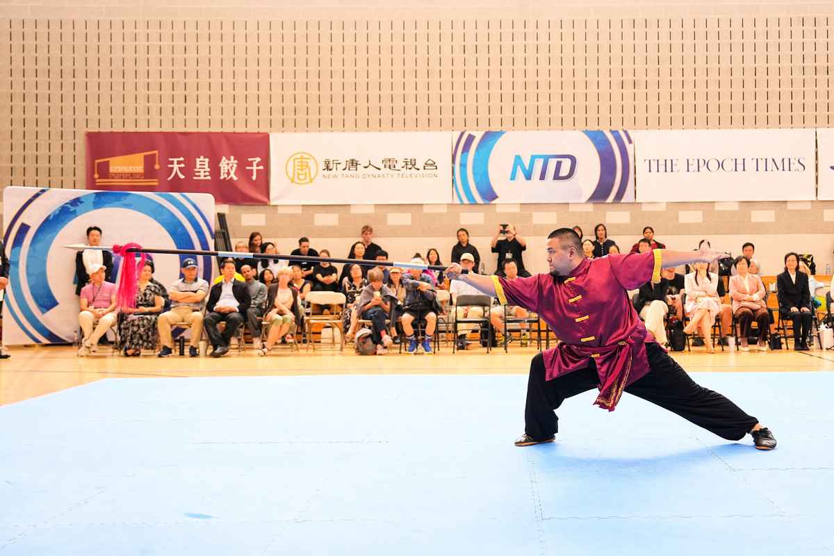 2024年9月2日,第八屆新唐人全世界中華傳統武術大賽在美國新澤西州沃爾德威克(Waldwick)舉行決賽。圖為哥倫比亞選手莫里西奧‧平松(Mauricio Pinzon)在男子器械組比賽中表演七星連環劍。(戴兵/大紀元)