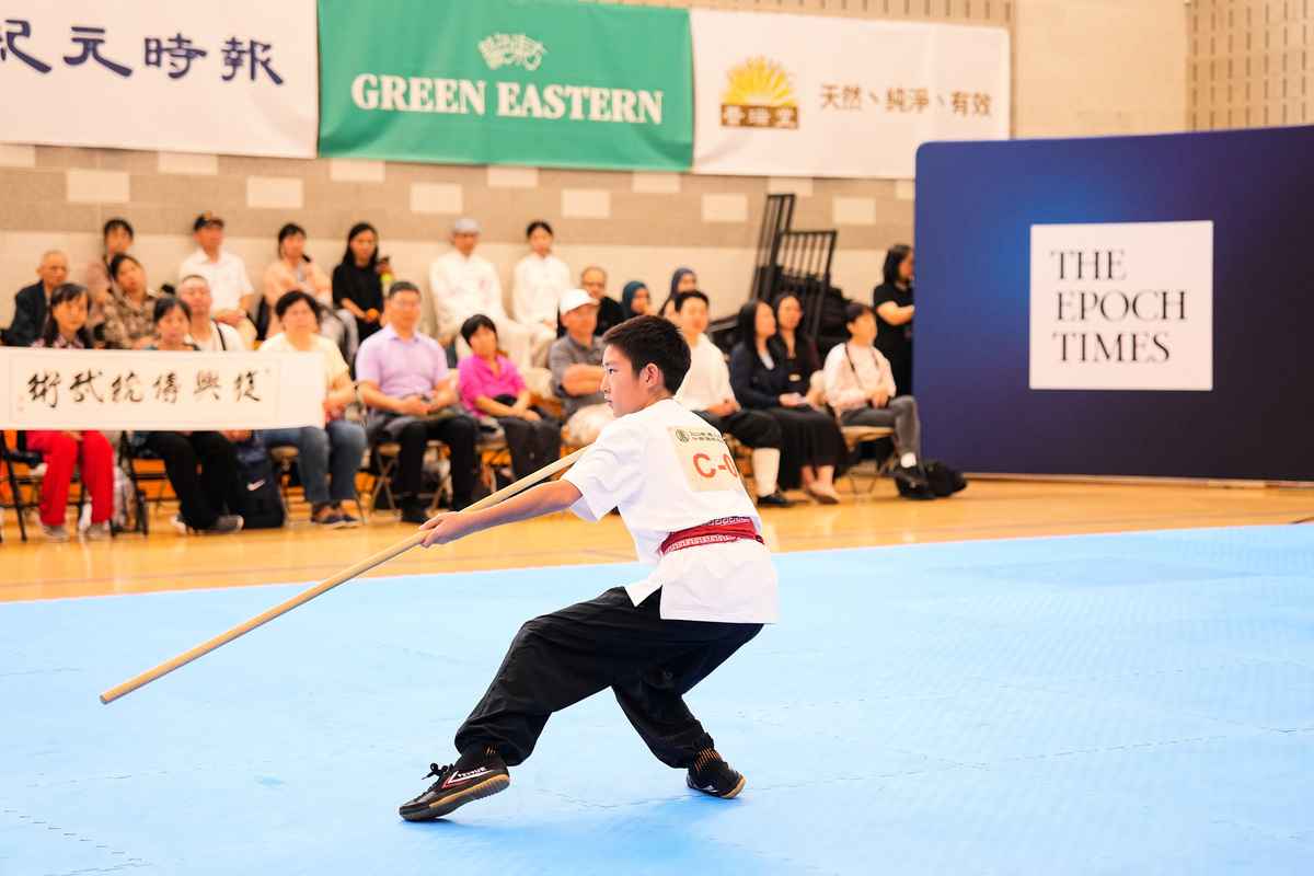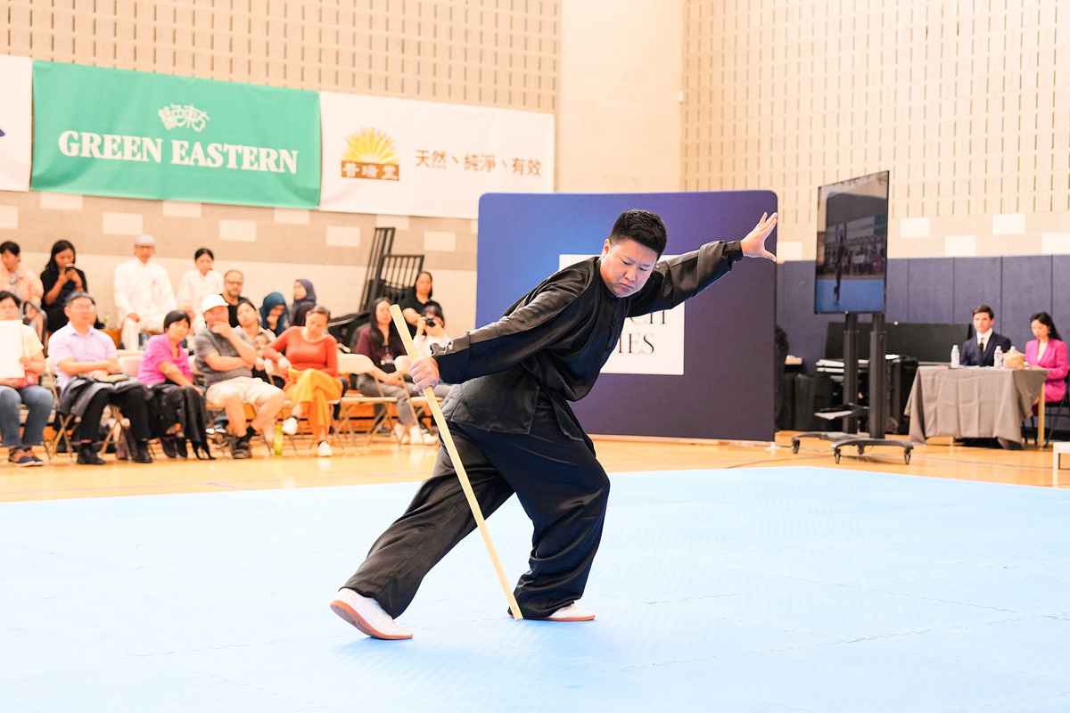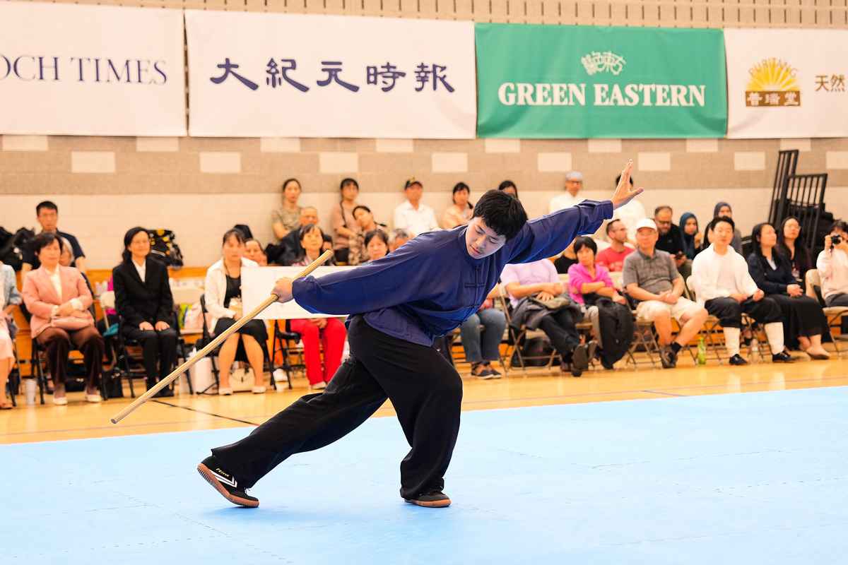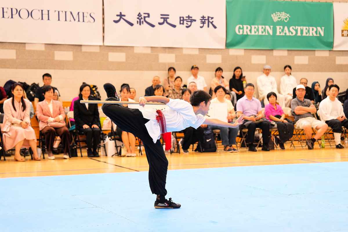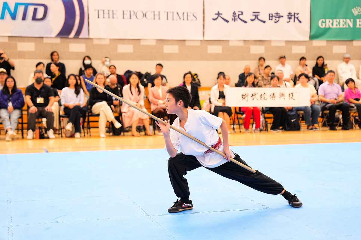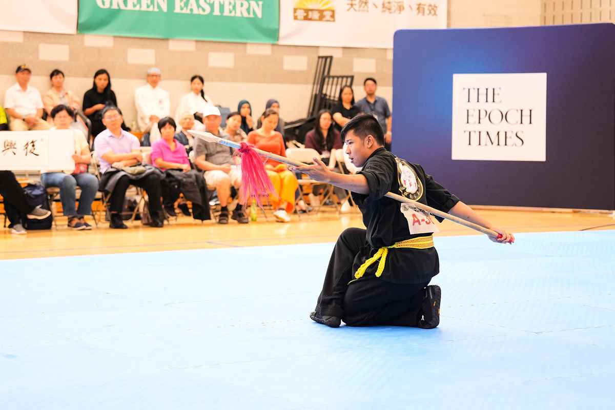 2024年9月2日,第八屆新唐人全世界中華傳統武術大賽在美國新澤西州沃爾德威克(Waldwick)舉行決賽。圖為美國選手克里斯‧查佩爾(Chris Chappell)在男子器械組比賽中表演七星鞭桿。(戴兵/大紀元)
