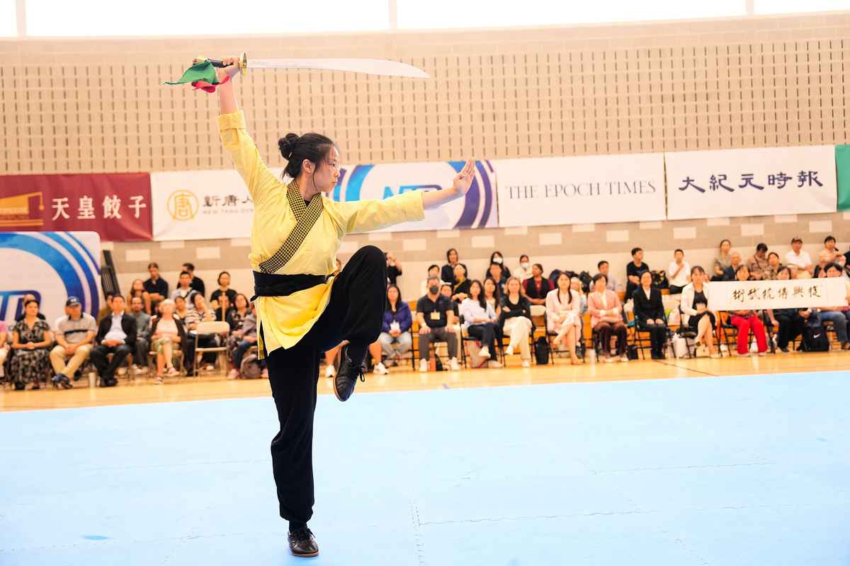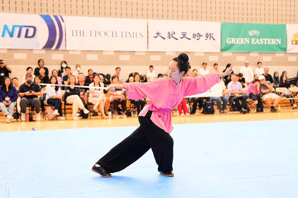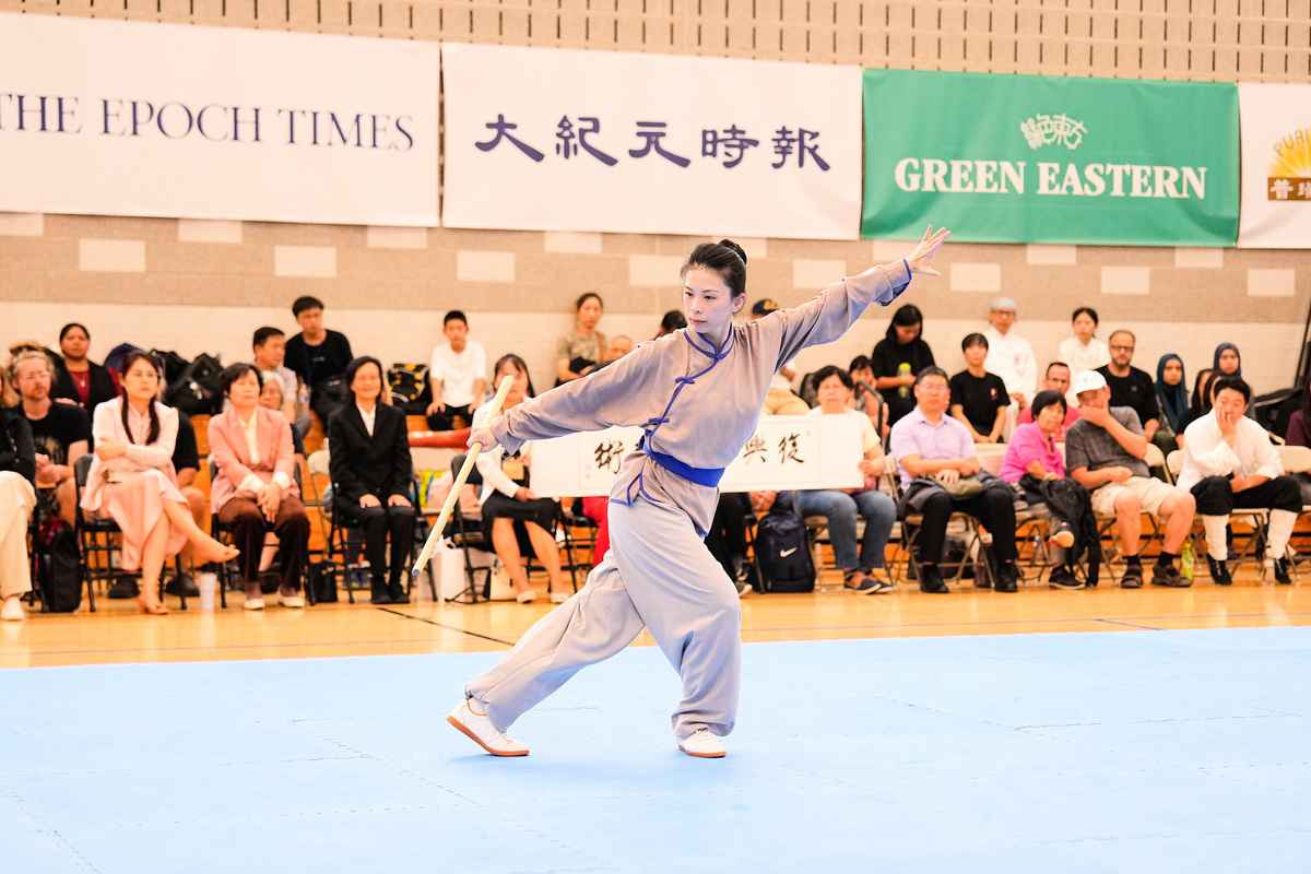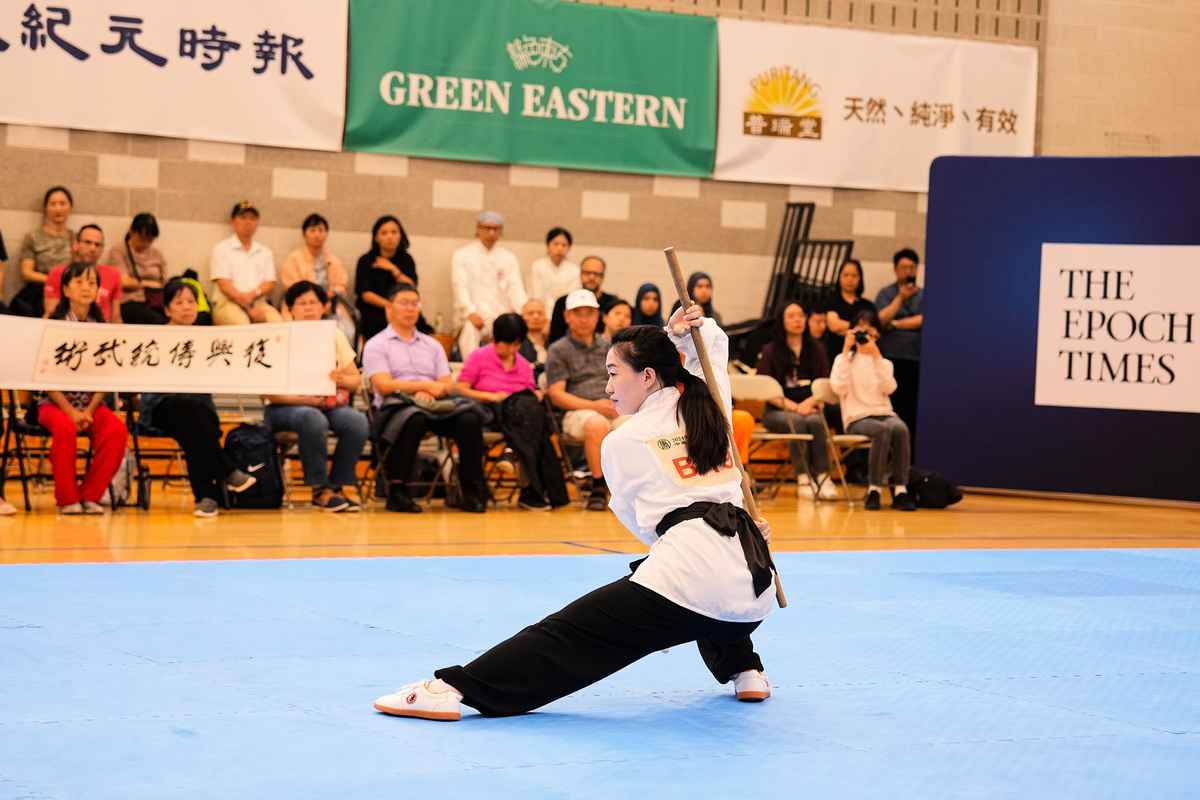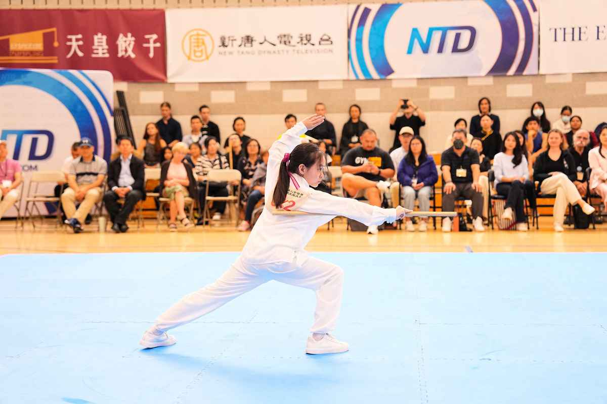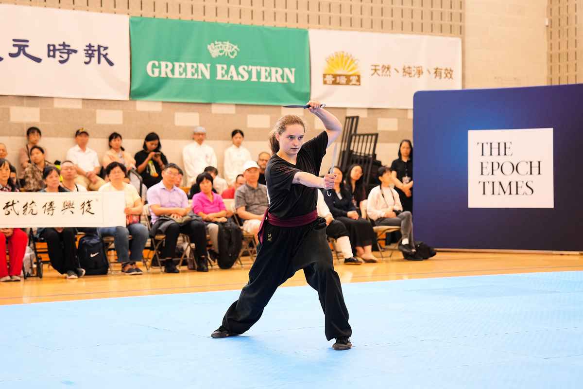 2024年9月2日,第八屆新唐人全世界中華傳統武術大賽在美國新澤西州沃爾德威克(Waldwick)舉行決賽。圖為美國選手梅根‧韋斯特曼(Megan Westerman)在女子器械組比賽中表演少林達摩劍。(戴兵/大紀元)