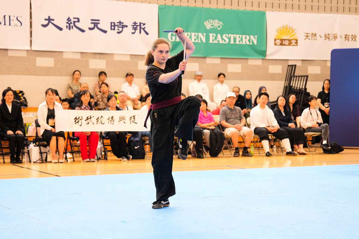 2024年9月2日,第八屆新唐人全世界中華傳統武術大賽在美國新澤西州沃爾德威克(Waldwick)舉行決賽。圖為德國選手皮亞‧特勞特納(Pia Trautner)在少年器械組比賽中表演雙匕首。(戴兵/大紀元)