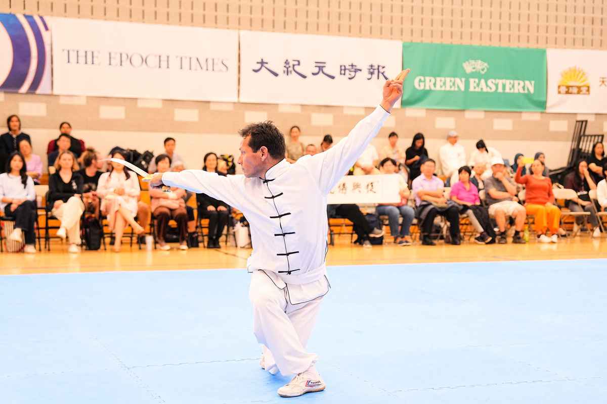 2024年9月2日,第八屆新唐人全世界中華傳統武術大賽在美國新澤西州沃爾德威克(Waldwick)舉行決賽。圖為德國選手歐陽德客(Eike Opfermann)在男子器械組比賽中表演奇門劍。(戴兵/大紀元)