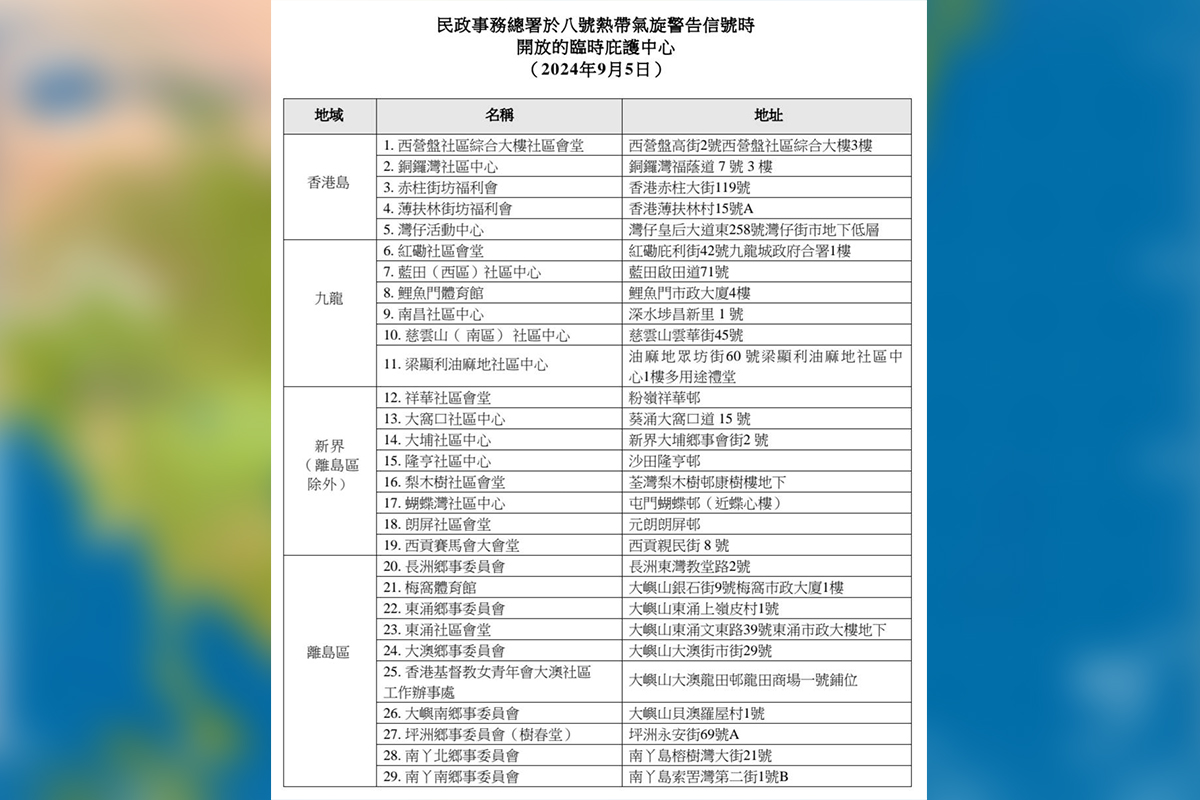 各區民政事務處今午4時起,開放共29個臨時庇護中心供有需要市民入住(附圖)。如有查詢,可致電民政事務總署緊急事故熱線:2572 8427。